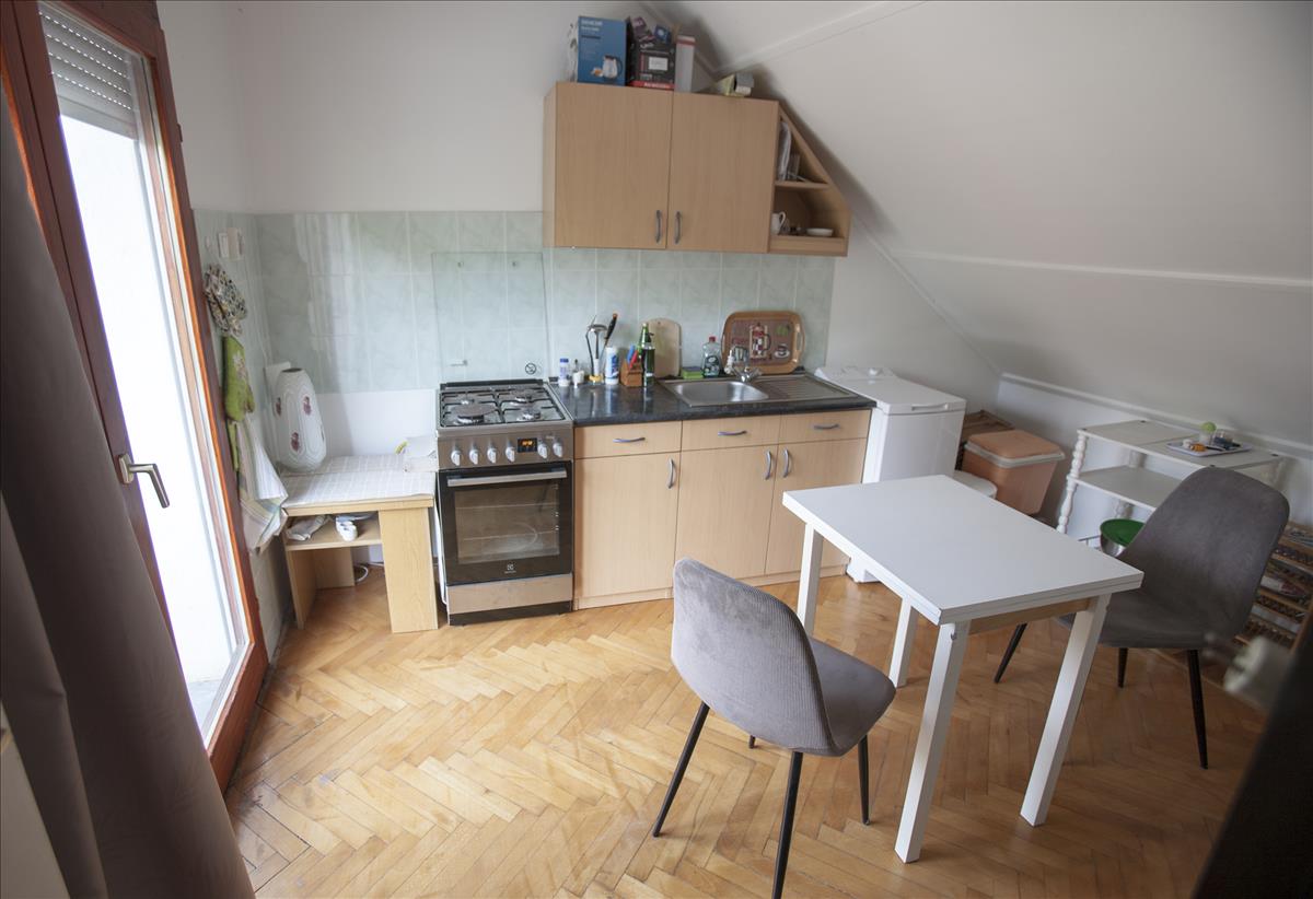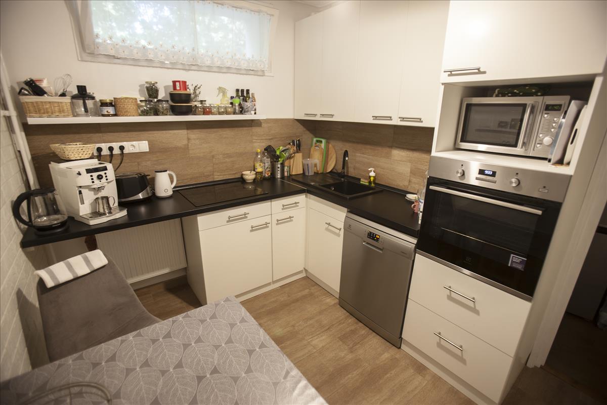 A földszinti konyha szintén 2022-ben került teljes felújításra (egyedi konyhabútorral és beépített Electrolux gépekkel). a földszinten a burkolatok nagyobb része szintén felújításra került.
