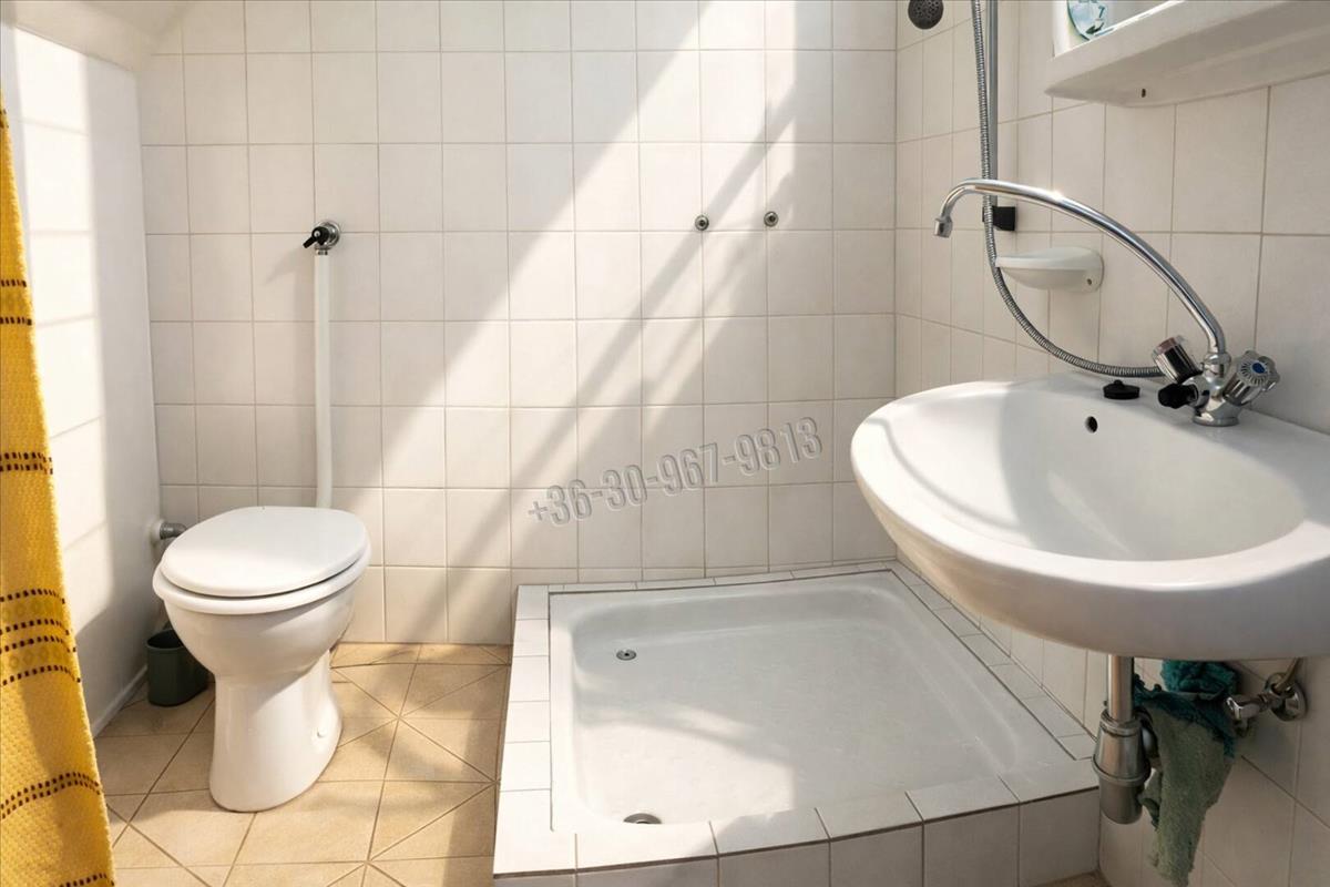 A 60 m2-es emeleti rész helyiségei: világos nappali, két szoba (az egyik erkélyes), tusolós fürdőszoba + WC.