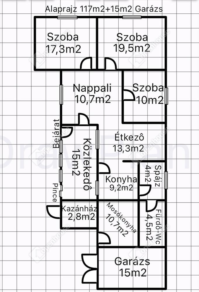 -Helyiségek 117m2 alapterületen: három szoba, nappali, étkező, közlekedő, konyha, spájz, fürdő-wc, mosókonyha, kazánház.