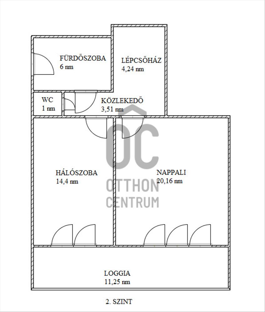 - 2. Félszint: tágas nappali loggiával, hálószoba loggiával, fürdőszoba (kád + zuhany), WC