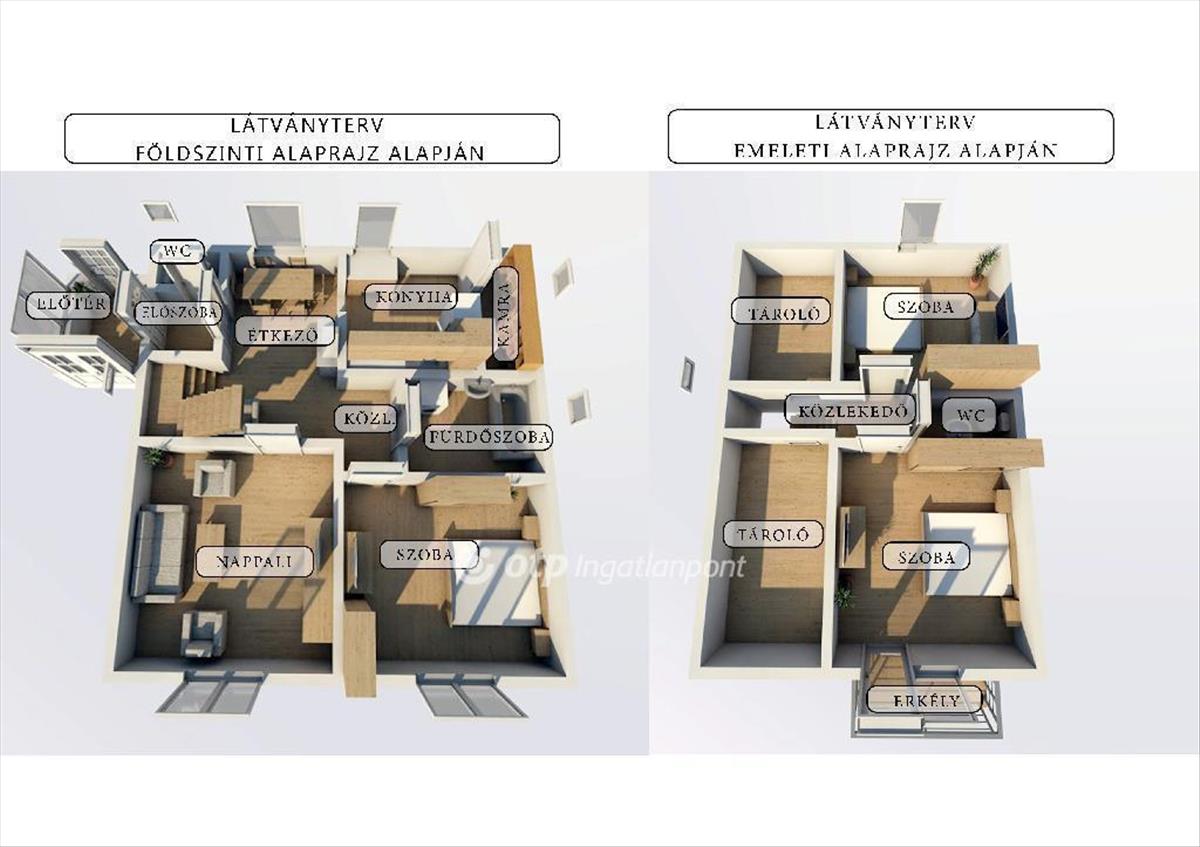 - Felső szint: 2 szoba (az egyikhez külön erkély tartozik), wc, tároló helyiségek (az emeleten és a lépcső alatt)