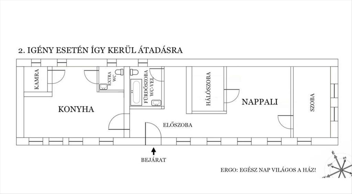 A konyha, nappali, fürdő, két wc, kamra, előszoba, garázs, pince és padlás kényelmesen szolgálja a mindennapokat.