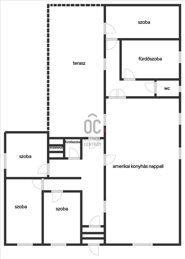 Az ingatlan alsó szintjén nagyméretű nappali-étkező-konyha (46 nm) és 4 különbejáratú szoba található.