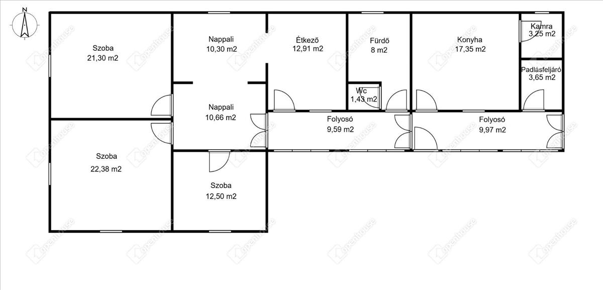 3 szoba + nappali, étkező, konyha, fürdő, wc, kamra, padlásfeljáró, 2 napfényes folyosó