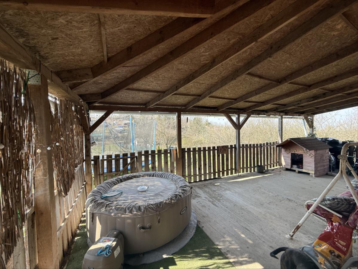 A házat körülöleli egy közel 70 m²-es, L alakú fedett terasz, ahonnan páratlan kilátás nyílik a környező tájra – ideális hely pihenésre, baráti összejövetelekre.