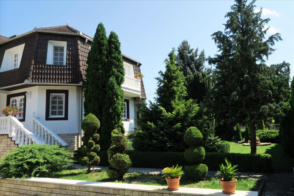 Az egész telek parkosított, van sziklakert, halastó, gyümölcsfák, épített grill, mellette kerti pavilon 8 ülőhellyel, központi asztallal, állítható tűzmagassággal, gránit fedlapokkal.