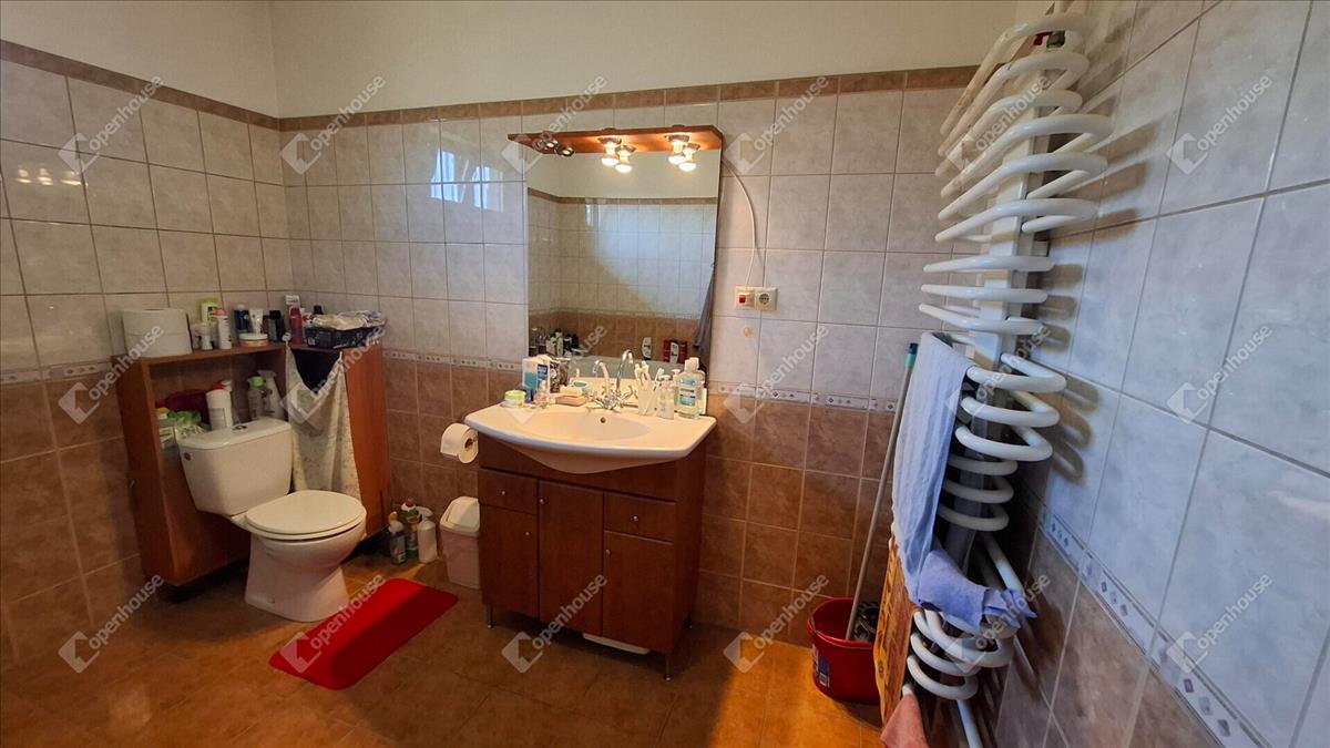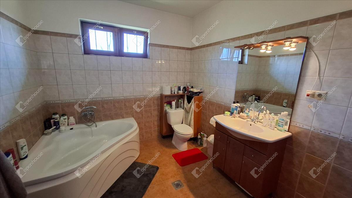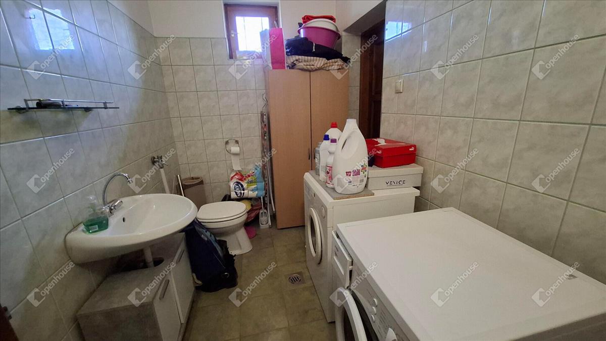 A nappaliból egy közlekedőn keresztül jutunk a többi helyiségbe. Nevezetesen a fürdőszoba, a mosókonyha, és a két másik szoba, amelyek ablakai a belső udvarra néznek. a fürdőszoba sarokkádas kialakítású. a családi házban két wc található, az egyik a fürdőben, a másik a mosókonyhában. a mosókonyhából nyílik a kazánház.
