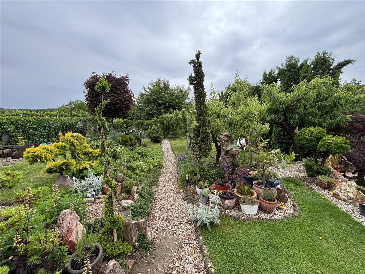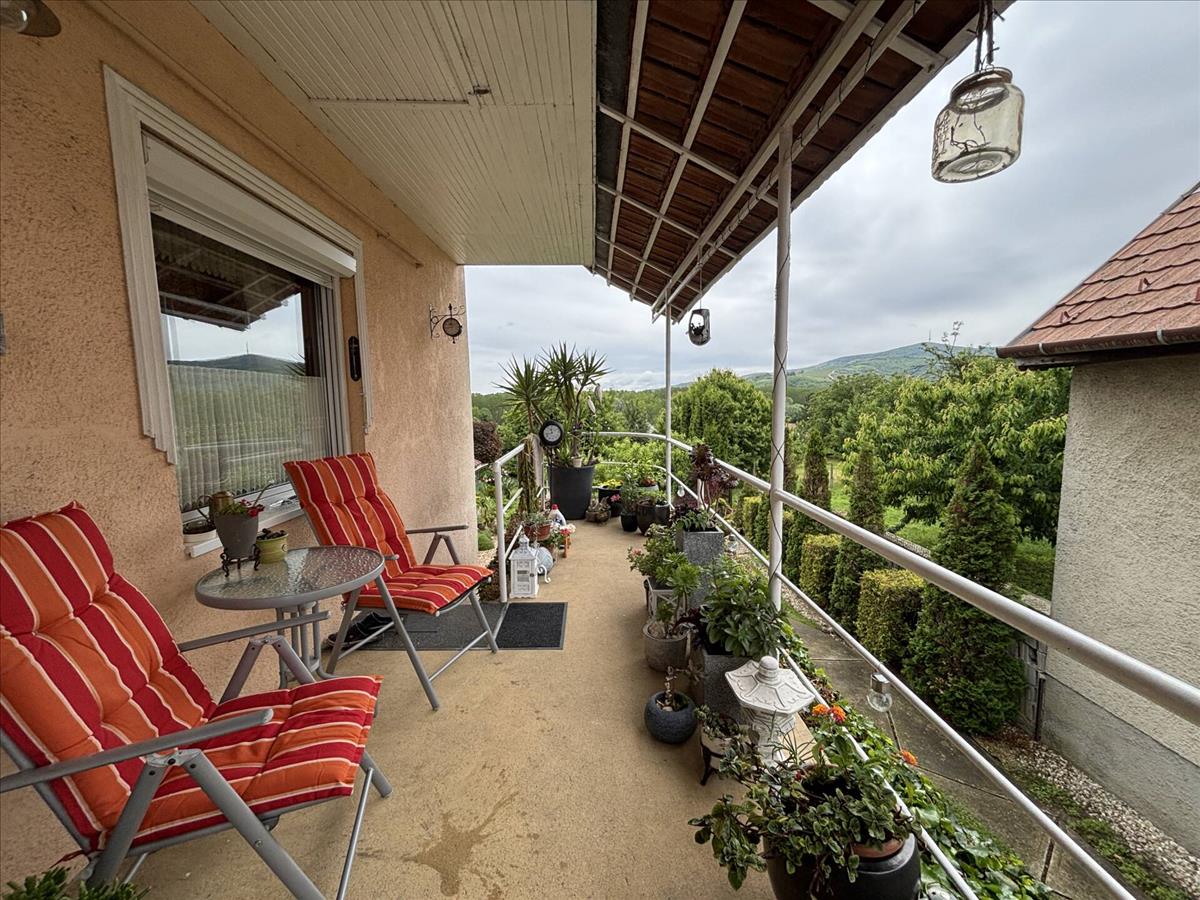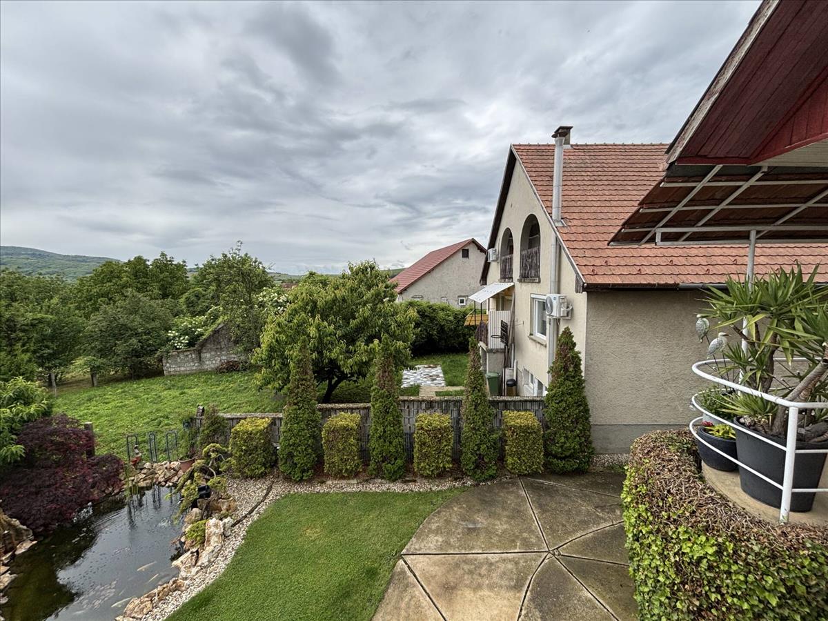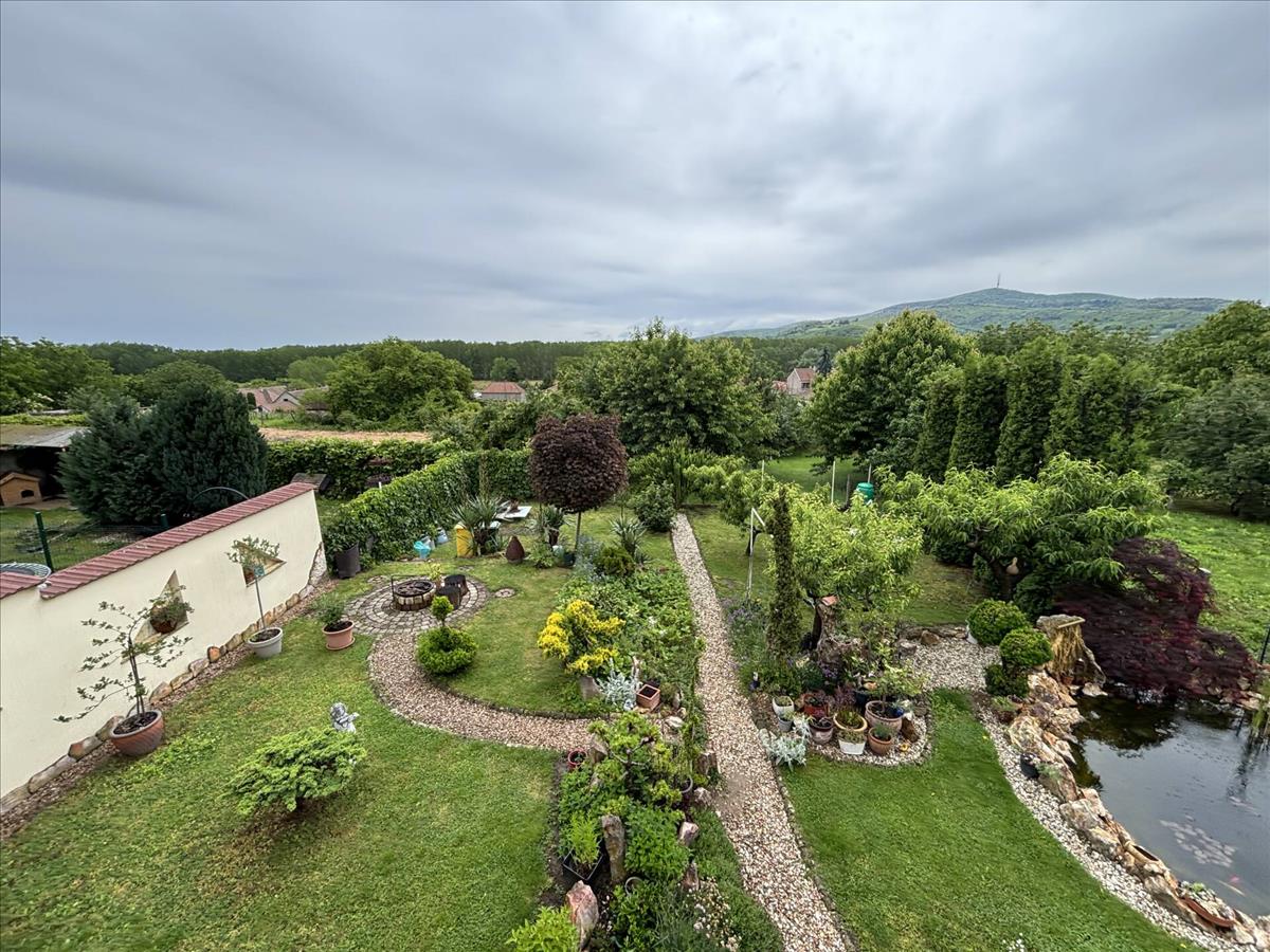 A konyhából nyíló terasz csodás kilátást nyújt a tokaji hegyre, és az impozáns kialakítású udvarra, ahol gyönyörű növények és egy kerti tó is megdobogtatja az ember szívét.