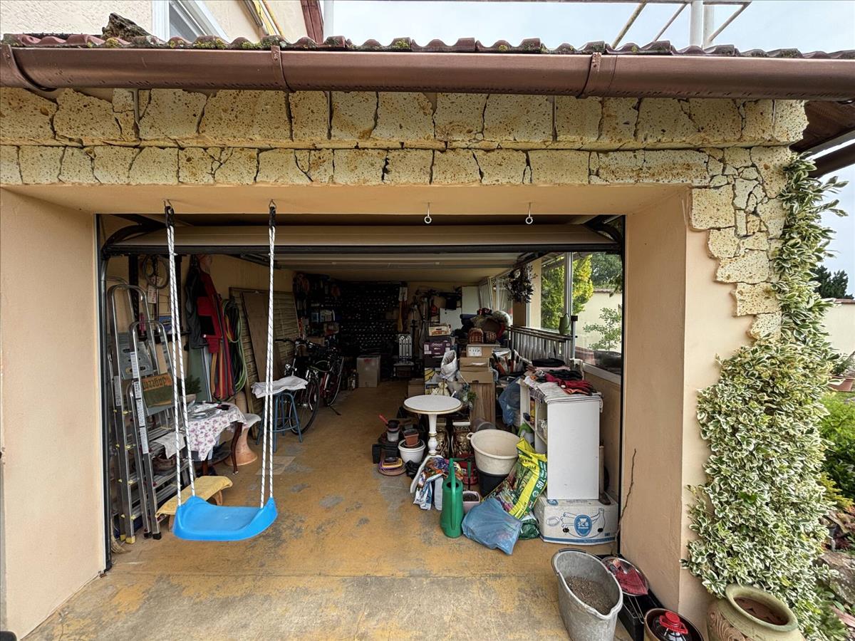 A ház alsó szintjén az utcafrontról elektromosan nyíló garázs, hátrafelé haladva egy kisebb tároló, illetve egy szuterén található amely fűthető, akár különálló lakrész is kialakítható belőle vagy télikertként is funkcionálhat.