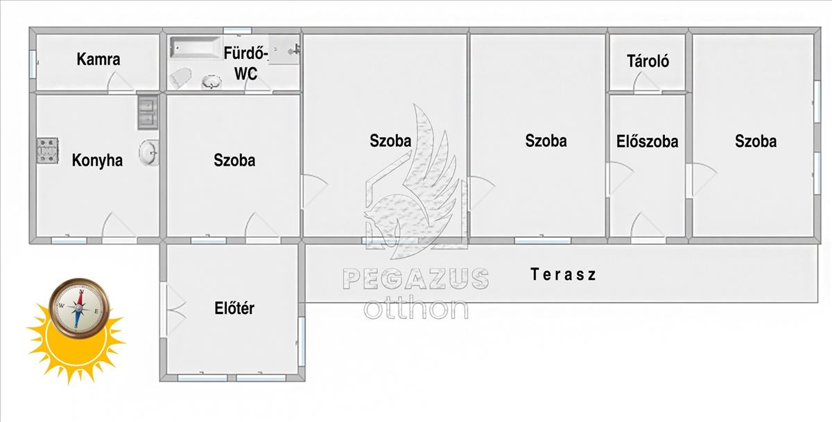 A belső tér rendkívül praktikus és rugalmasan alakítható: az egymásból nyíló, tágas szobák, valamint a különnyíló konyha és kamra mellett az épület adottságai lehetővé teszik két teljesen különálló lakrész kialakítását is.
