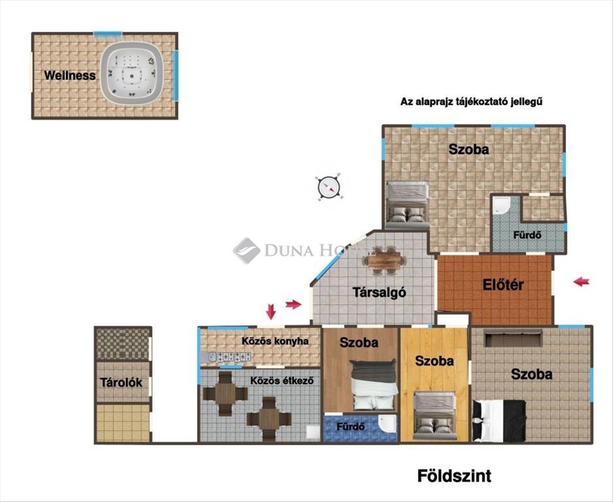 Főbb jellemzők: a földszinten egy nagyobb, többhelységes apartman található, amely kényelmes életteret biztosít. Az első emeleten két különbejáratú apartman saját fürdőszobával. Közös, tágas konyha és étkező a családi összejövetelekhez. Az udvarban parkolási lehetőség, biztosítva a kényelmes parkolást. Közös fedett terasz grillezési lehetőséggel és pihenőhellyel. a különálló kis épületben jakuzzi és szauna található, ideális a relaxációra.