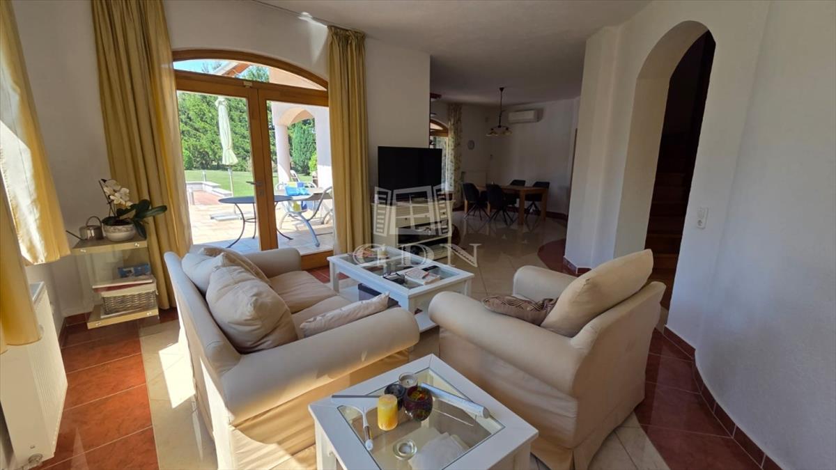 A gondosan kialakított kertben nagy méretű medence, ápolt zöld területek, dupla kocsibeálló, valamint további udvari parkolóhelyek találhatók. a teljesen felszerelt melléképület vendégházként vagy hobbihelyiségként is tökéletesen használható.