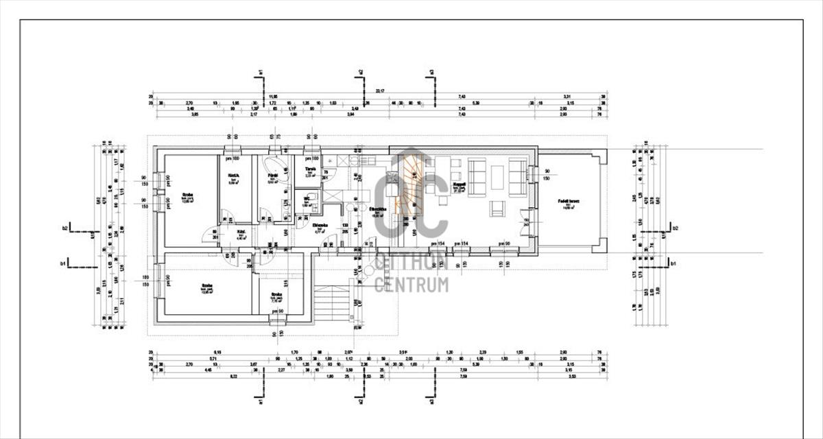 - földszint: 3 szoba, nappali-konyha-étkező, fürdőszoba, külön wc, háztartási helyiség, előszoba, tároló, közlekedő