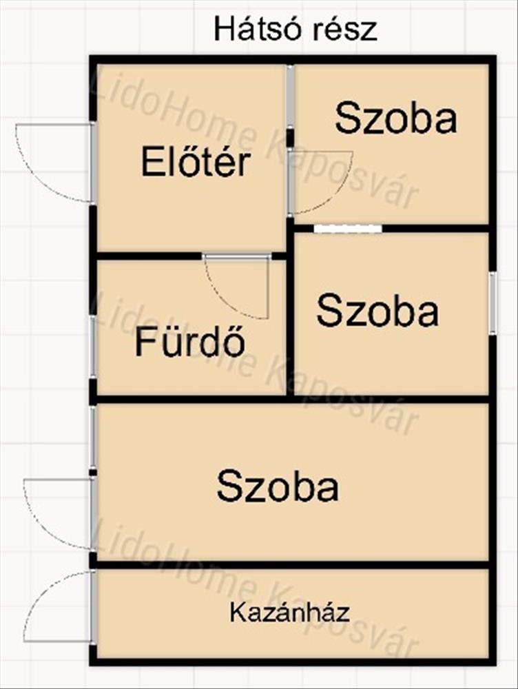 A hátsó helyiségek az udvarról nyílnak, a szobának alakított tároló és az első lakrész között található a kazánház.