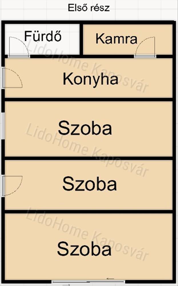 Az első lakrészben két bejárat is található, itt kialakításra került 3 szoba, egy konyha, fürdő wc-vel, és egy kamra.