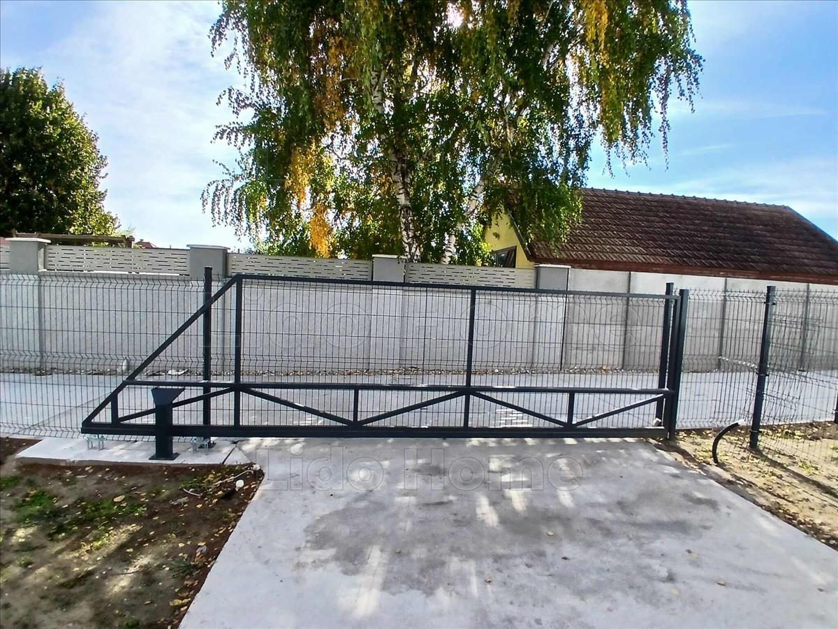 -Széles, betonozott kocsibeálló, modern kerítés, tolókapu
