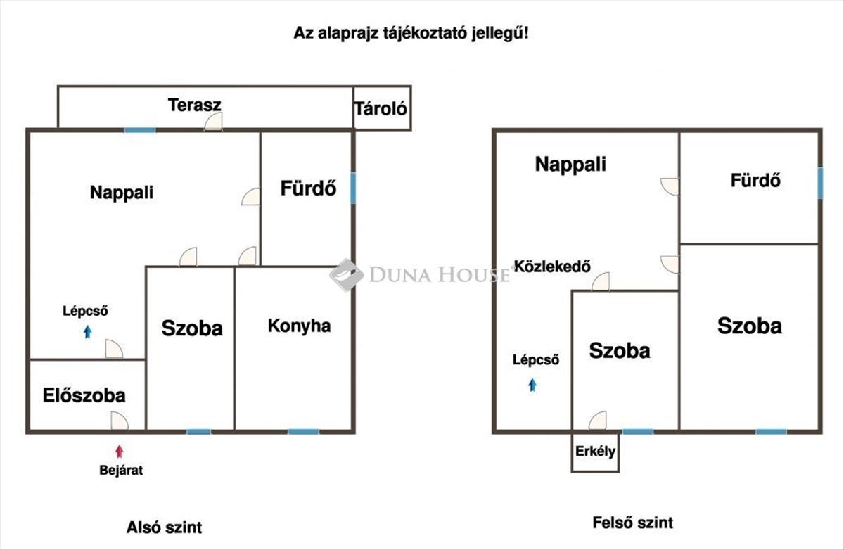 Az emeleten egy világos nappali, két hálószoba, fürdőszoba és egy praktikus tároló található ideális akár külön élettérként is.