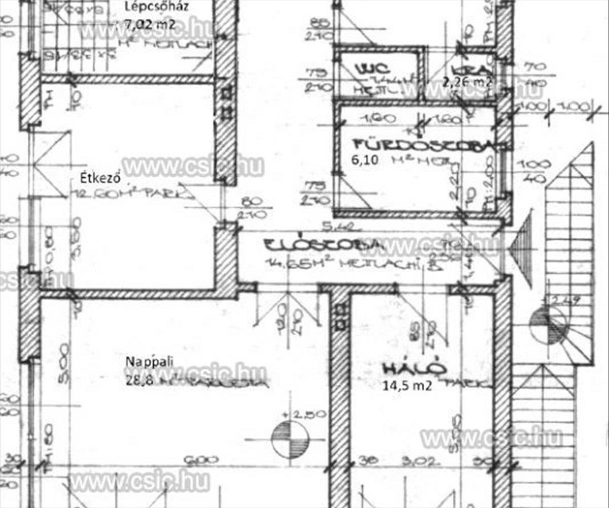 - földszinten: nappali (30nm), hálószoba (14, 5 nm), konyha, kamra, fürdőszoba, wc, tároló, terasz (21 nm)