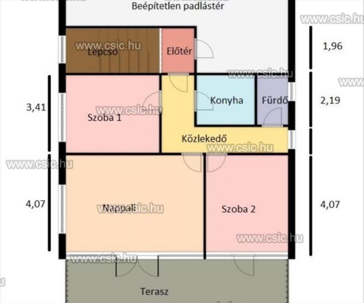 - emeleten: nappali (24 nm), 2 hálószoba (12 ill 13 nm), konyha, fürdőszoba, terasz (22 nm) található