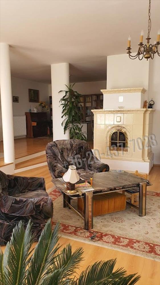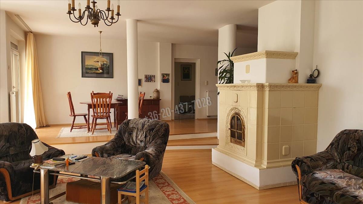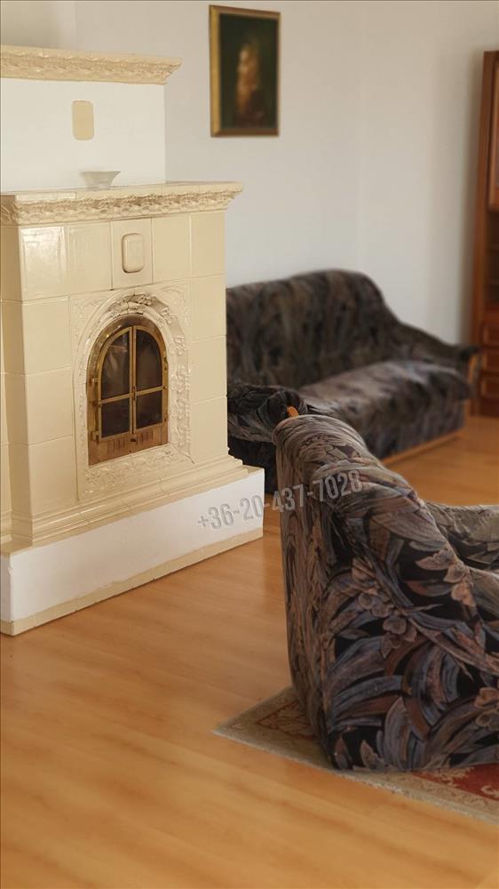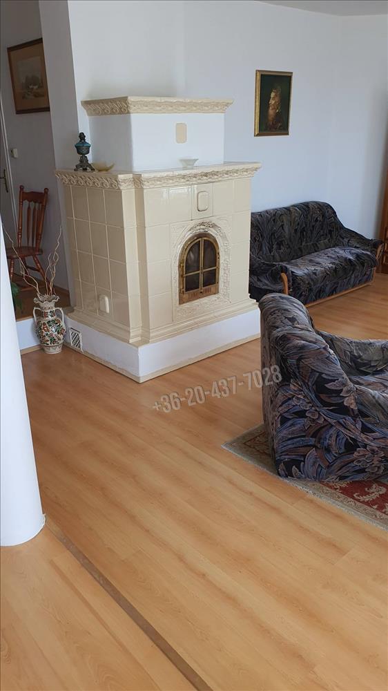 -az étkező -nappali – könyvtárszoba egy légtérben található, de a nappalit egy szint különbség választja el. a nappaliban egy gyönyörű cserépkályha biztosítja ennek a szintnek a melegét valamint kondenzációs gázkazán radiátoros hőleadókkal és ez biztosítja a meleg vizet is.