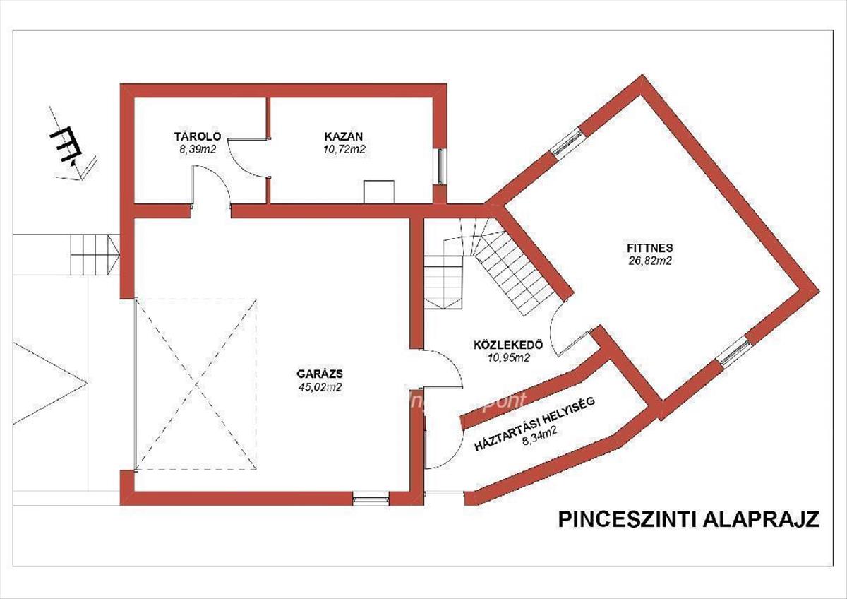 A fűtött és természetes megvilágítással is rendelkező pincében két állásos gépkocsitárolót, fitnesztermet, különböző tárolókat, és kazán helyiséget alakítottak ki.