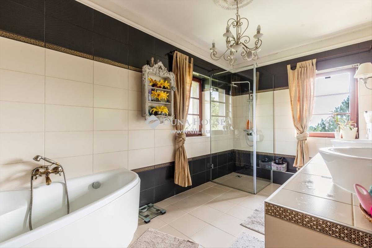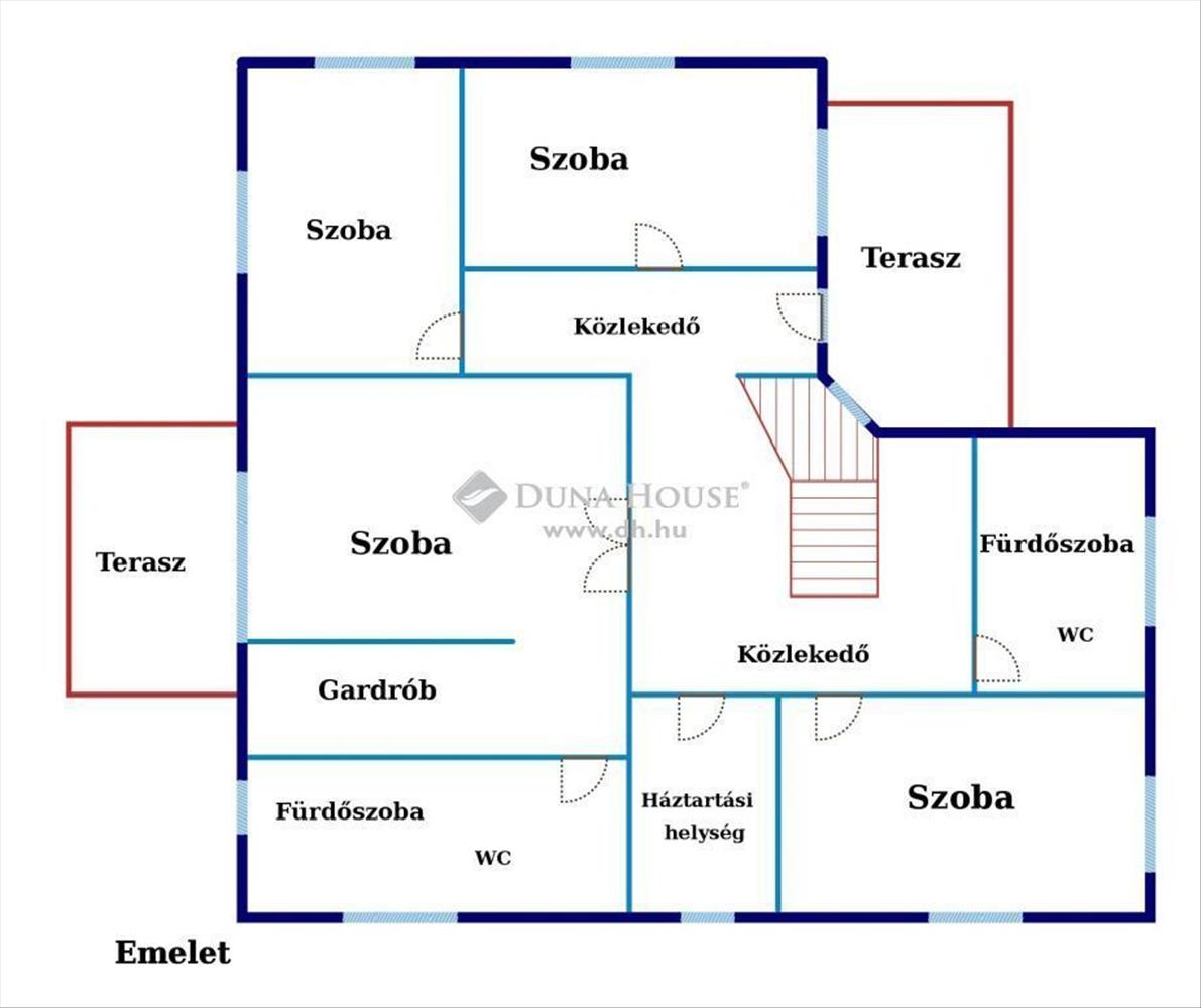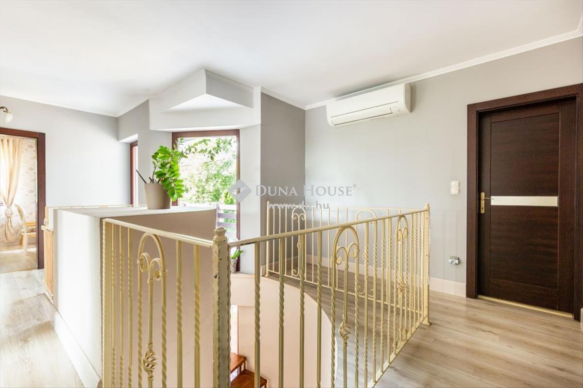 Az emeleten további 4 hálószoba, melyből egynek saját fürdőszobája, gardróbja és egy panorámás terasza is van, valamint még egy fürdőszoba és egy háztartási helyiség található ezen a szinten.