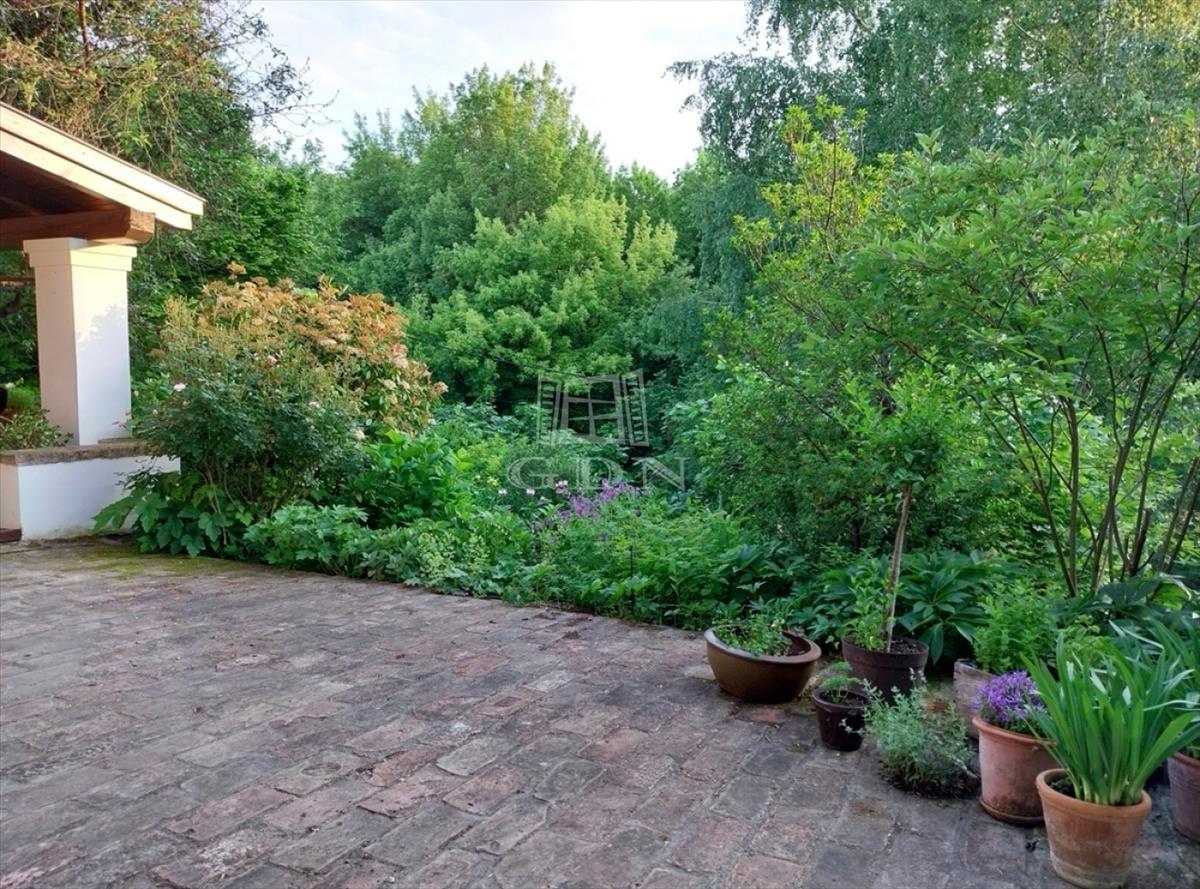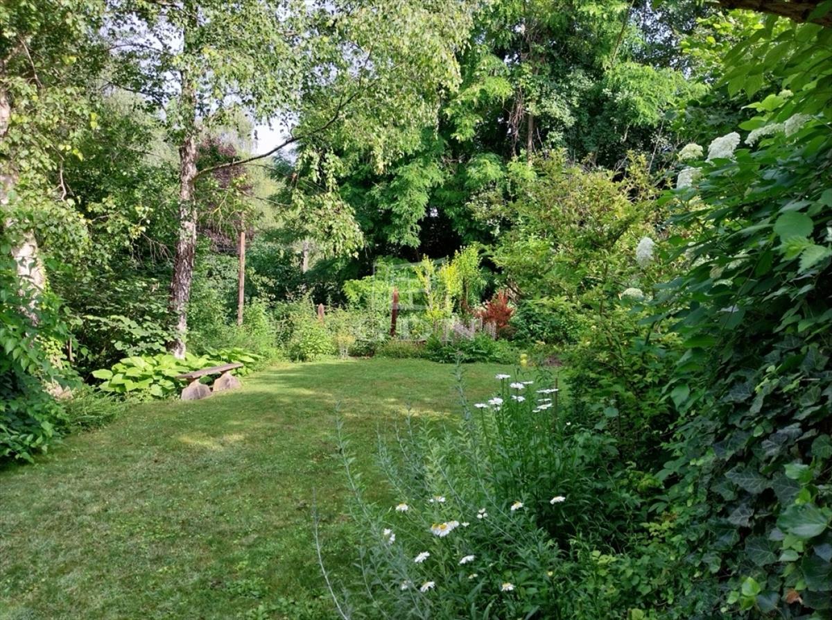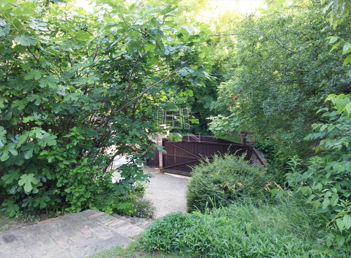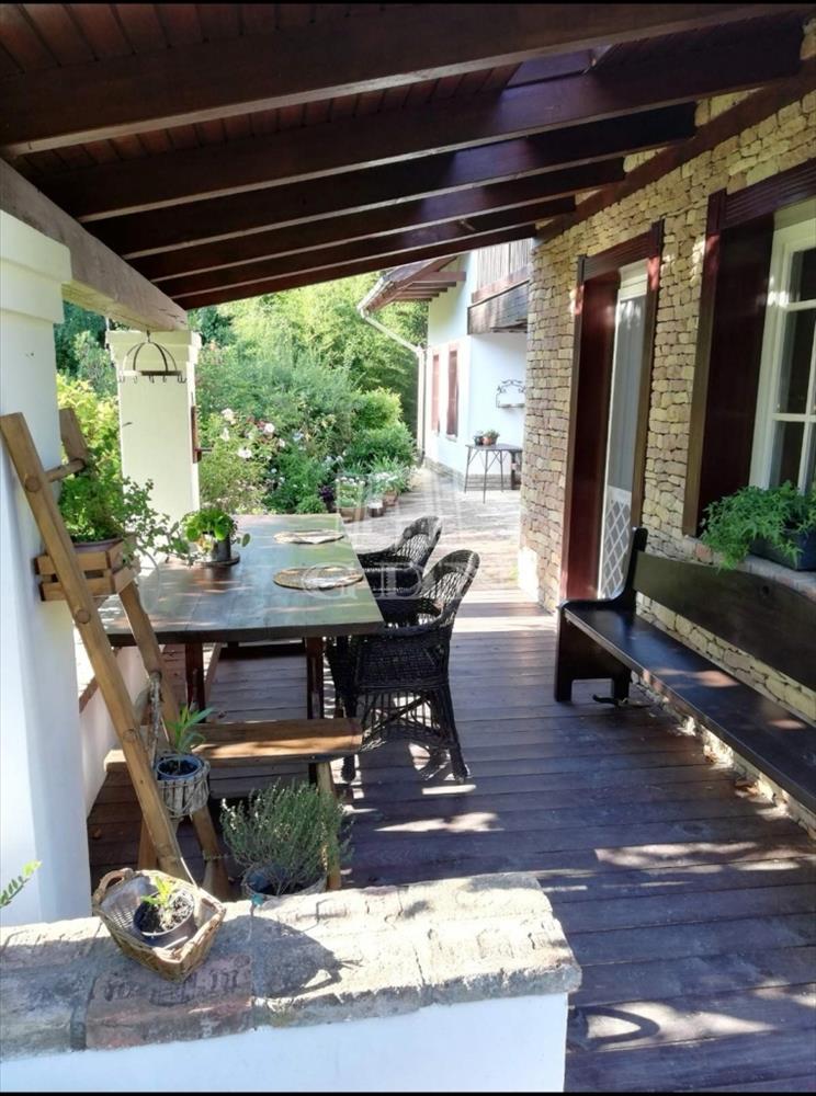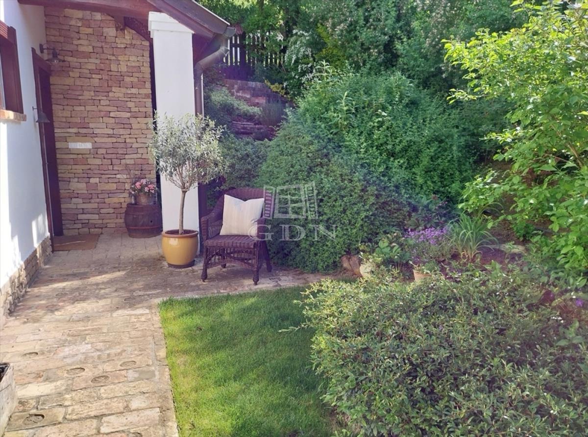 A kert teraszos elrendezésű, automata öntözőrendszerrel és kúttal ellátott. a kialakítása óta eltelt több mint 20 évben a fák, cserjék, talajtakarók, virágos növények nagyszámú együttese és mérete kivételesen szép, barátságos, madárcsicsergős és intim környezetet biztosít. a házban a nappali jellegzetes hangulatát hatalmas, nyitott tűzterű kőkandalló, egyedi kialakítású kőlépcső és több mint százéves gerendákból álló fa álmennyezet adja meg, ami a konyhában és a hálószobában is megjelenik. a nappali és a konyha is közvetlen kertkapcsolatos a fedett és nyitott teraszokkal. Az emeleti hálószobákból a kert és a tágabb természeti környezet felé néző fedett erkélyre lehet kijutni.