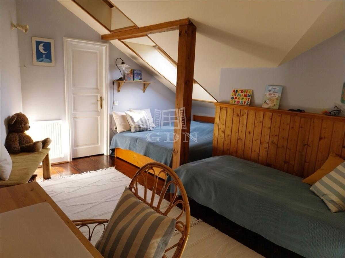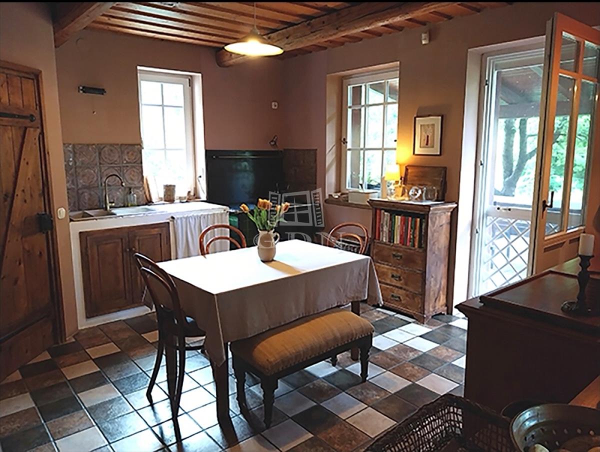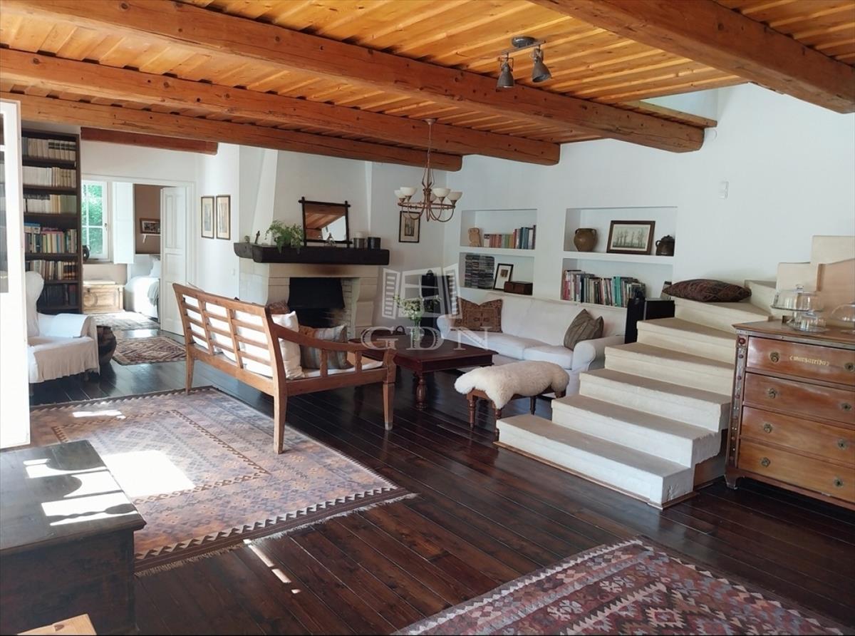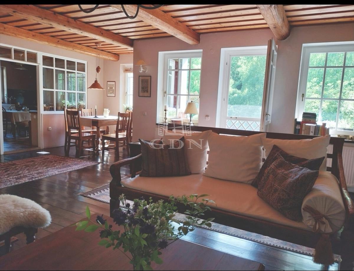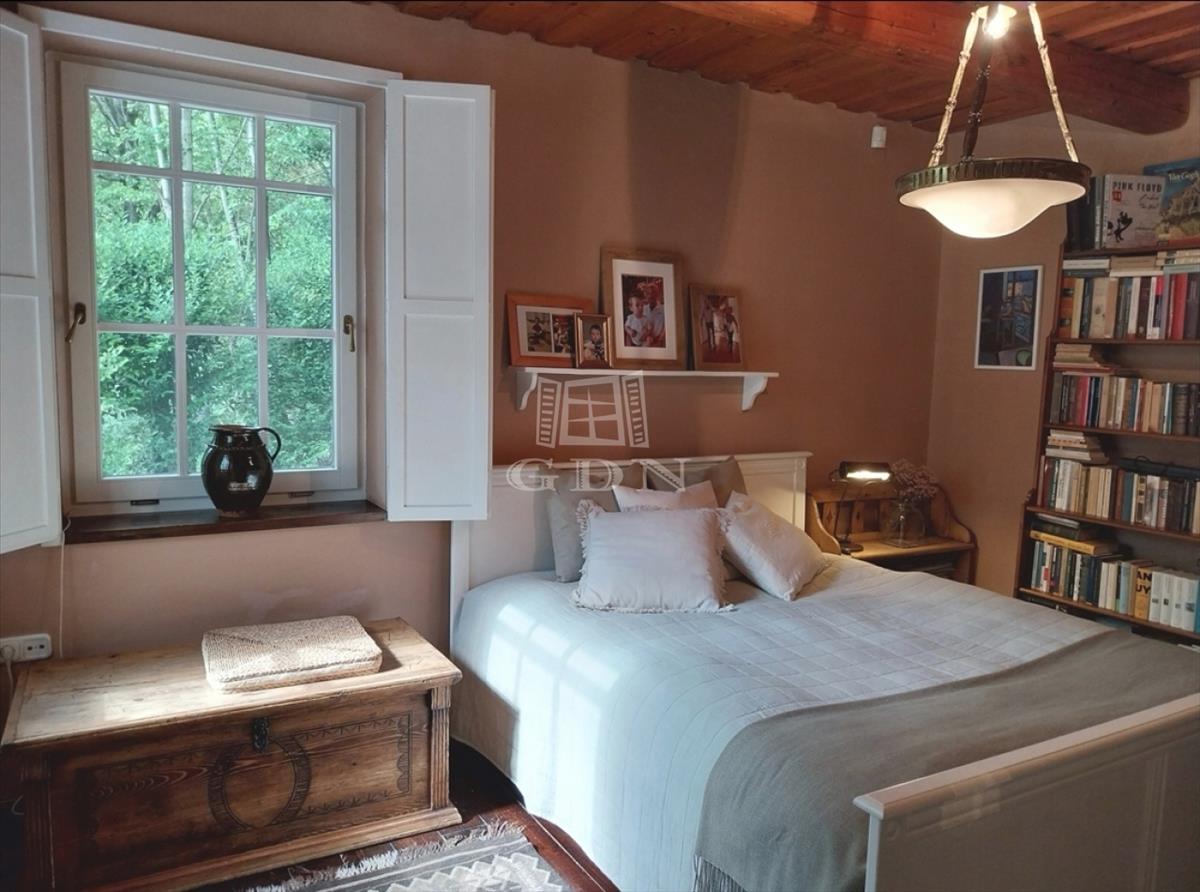 A kert teraszos elrendezésű, automata öntözőrendszerrel és kúttal ellátott. a kialakítása óta eltelt több mint 20 évben a fák, cserjék, talajtakarók, virágos növények nagyszámú együttese és mérete kivételesen szép, barátságos, madárcsicsergős és intim környezetet biztosít. a házban a nappali jellegzetes hangulatát hatalmas, nyitott tűzterű kőkandalló, egyedi kialakítású kőlépcső és több mint százéves gerendákból álló fa álmennyezet adja meg, ami a konyhában és a hálószobában is megjelenik. a nappali és a konyha is közvetlen kertkapcsolatos a fedett és nyitott teraszokkal. Az emeleti hálószobákból a kert és a tágabb természeti környezet felé néző fedett erkélyre lehet kijutni.