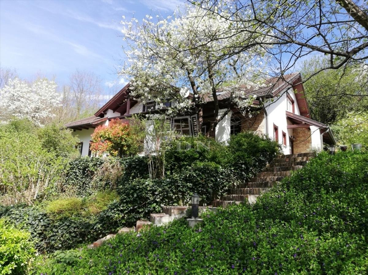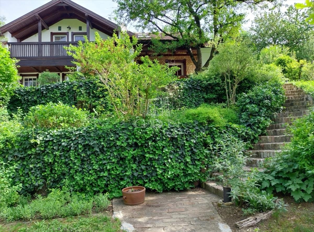 Budaörs Kamaraerdőn eladó egy kivételes hangulatú és adottságú, egyedi stílusú családi ház. a teleknek két utcáról van bejárata, elhelyezkedése olyan, mintha egy parkerdő közepén lenne, a házat minden oldalról romantikus kert öleli körül, ide néz és nyílik minden nyílászáró. Csak egy szomszédja van, a szemben lévő oldalon mogyorós, ős fák és kis tó található.A ház fő frontja déli fekvésű, a telek felső részén helyezkedik el, részben besüllyesztve a domboldalba, jól illeszkedik a természeti környezetbe, nem hivalkodó.