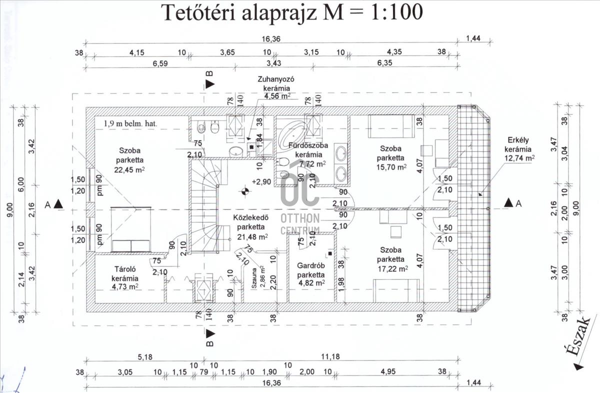 tágas galéria/közlekedő, óriási (22, 45 m2-es) szülői háló saját fürdőszoba/WC-vel, gardróbbal, szauna (nem megépített), kis dolgozószoba (4, 82 m2), nagy fürdőszoba sarokkáddal, és két nagy gyerekszoba található. a két gyerekszobából közös erkély nyílik, ahonnan a kertre van kilátás.