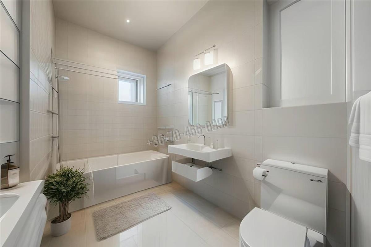A teljesen intim hátsó kertben szépen kialakított 60 nm-es terasz nyújt ideális helyet a kikapcsolódásra, az alatta lévő teljes terület alkalmas tárolási célra, de kiváló lehet borospincének is.