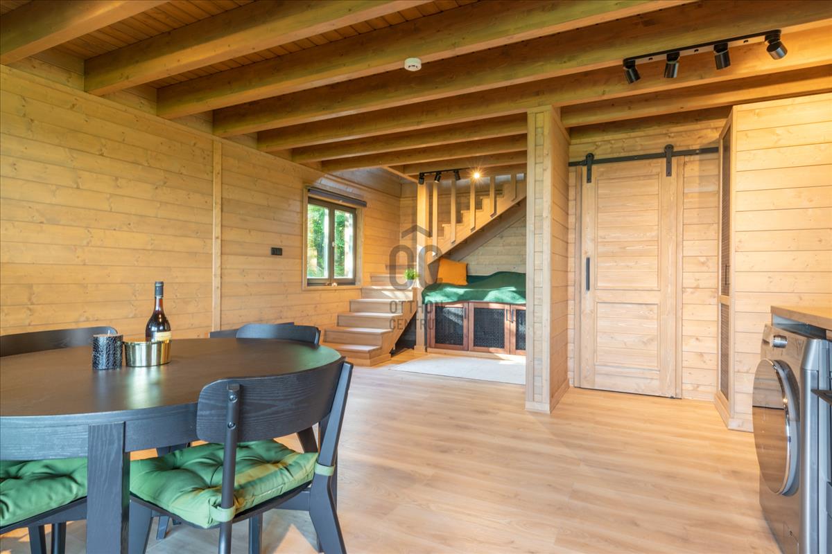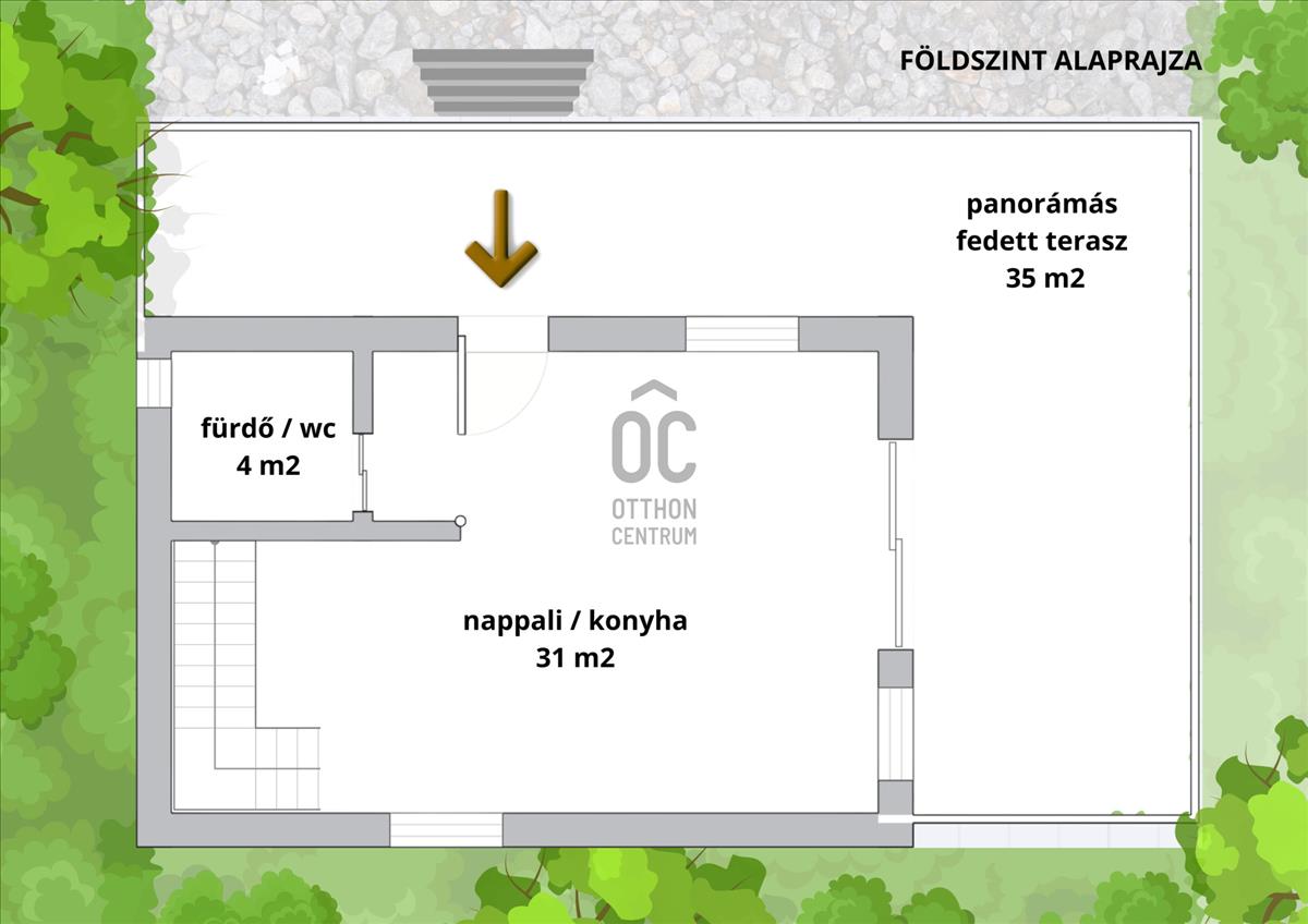 a 35 m2-es földszinten kapott helyet a konyha-étkező-nappali, a zuhanyzós fürdőszoba wc-vel és a hatalmas, 35 m2-es panorámás fedett terasz,