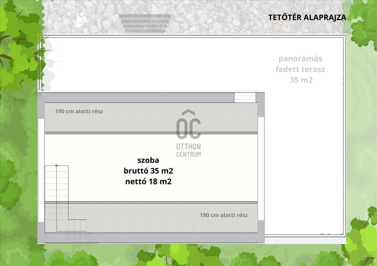 a bruttó 35, nettó 18 m2-es tetőtérben pedig egy nagy szoba van, amiből akár két hálószoba is kialakítható.
