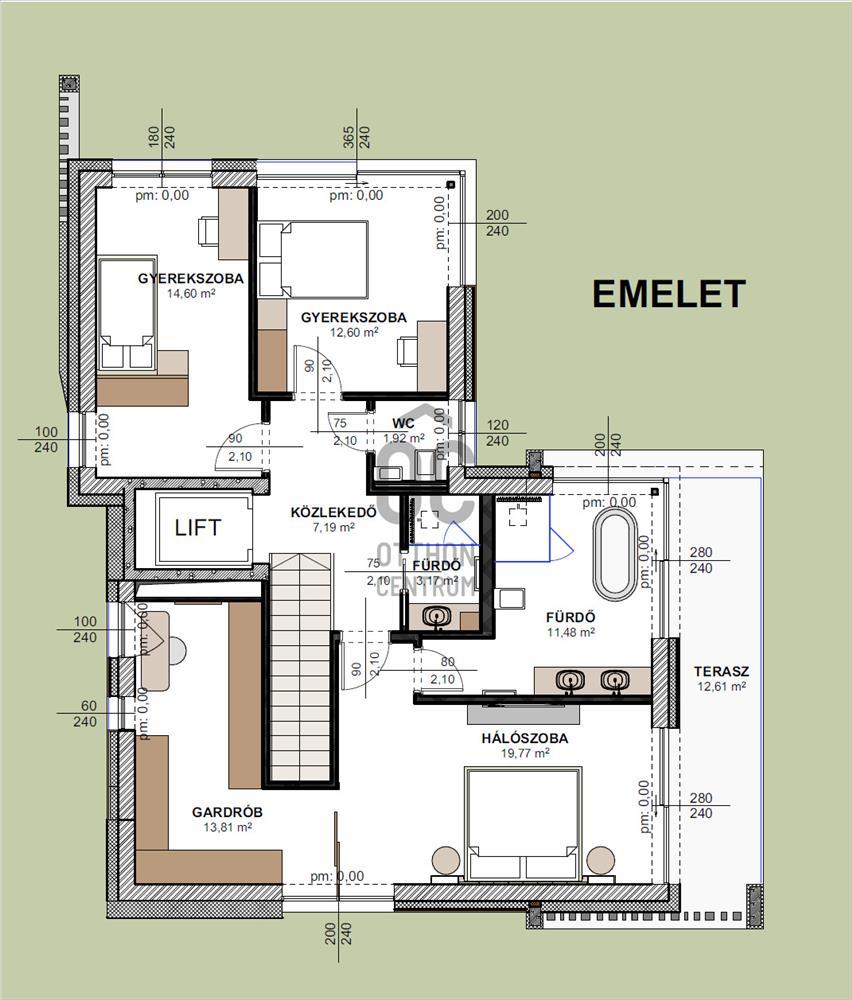 A legfelső szinten a hálóterek kerültek kialakításra, ahol minden szoba jól használható alapterülettel büszkélkedhet, és a masterbedroom kiválóan elkülönül a többi hálótól!