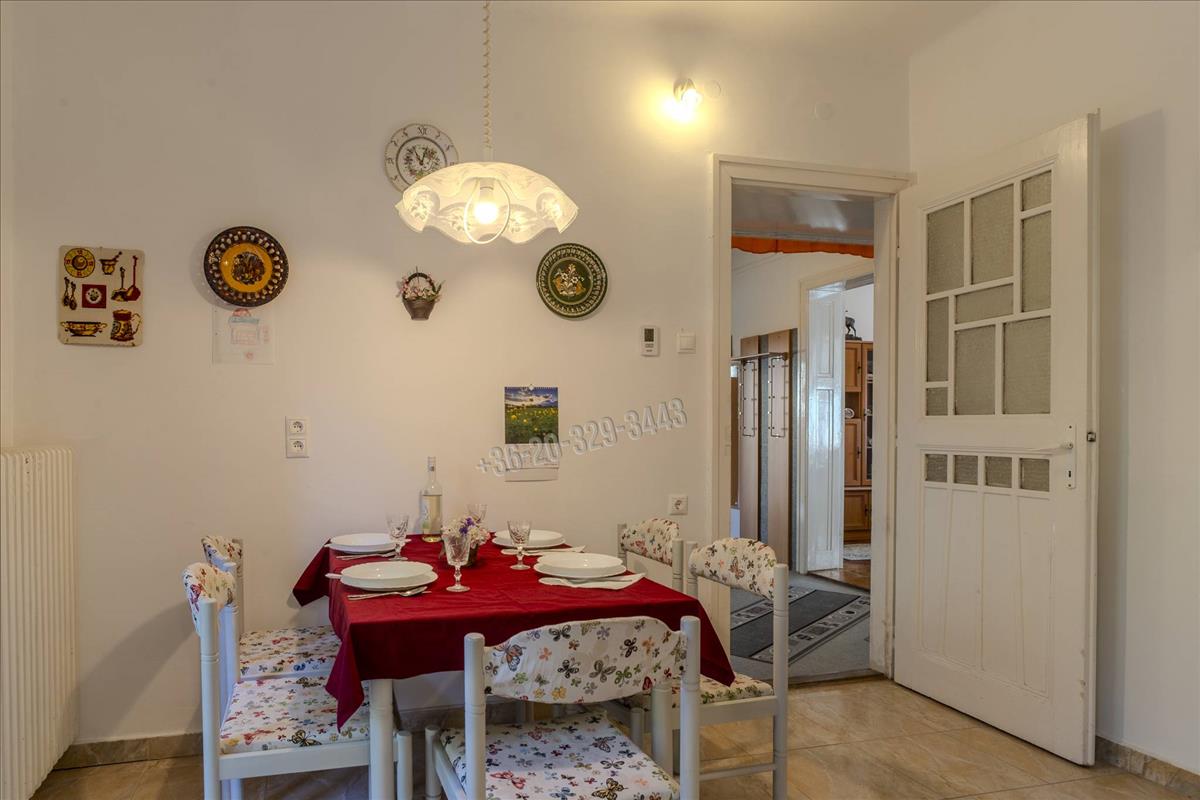 The raised ground floor covers 86 sqm, featuring 3 rooms, an entrance hall, kitchen, pantry, and bathroom. The complete kitchen furniture is included in the price, equipped with an Electrolux ceramic hob and oven, Zanussi extractor hood, and Bosch dishwasher for 12 place settings. The rooms have traditional parquet flooring, while the other areas are tiled. The charming glass-paneled older double interior doors add a special atmosphere. The exterior doors and windows were replaced in 2007 with high-quality thermal and sound-insulated glass, fitted with mosquito nets and shutters. The ground floor also includes a covered 7. 4 Sqm terrace facing east, located in front of the entrance.