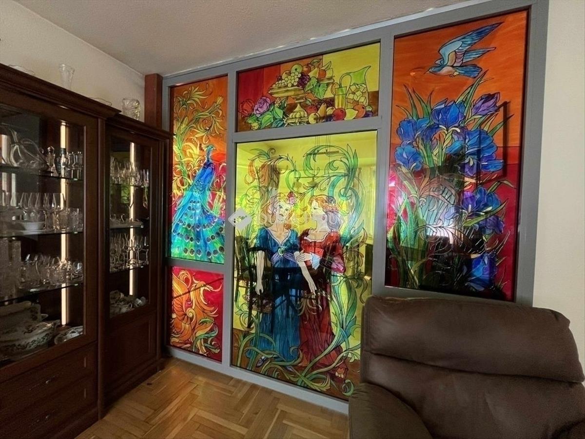 - neves üvegművész tervei alapján készült különleges üveg tolóajtó a nappali és étkező elválasztására