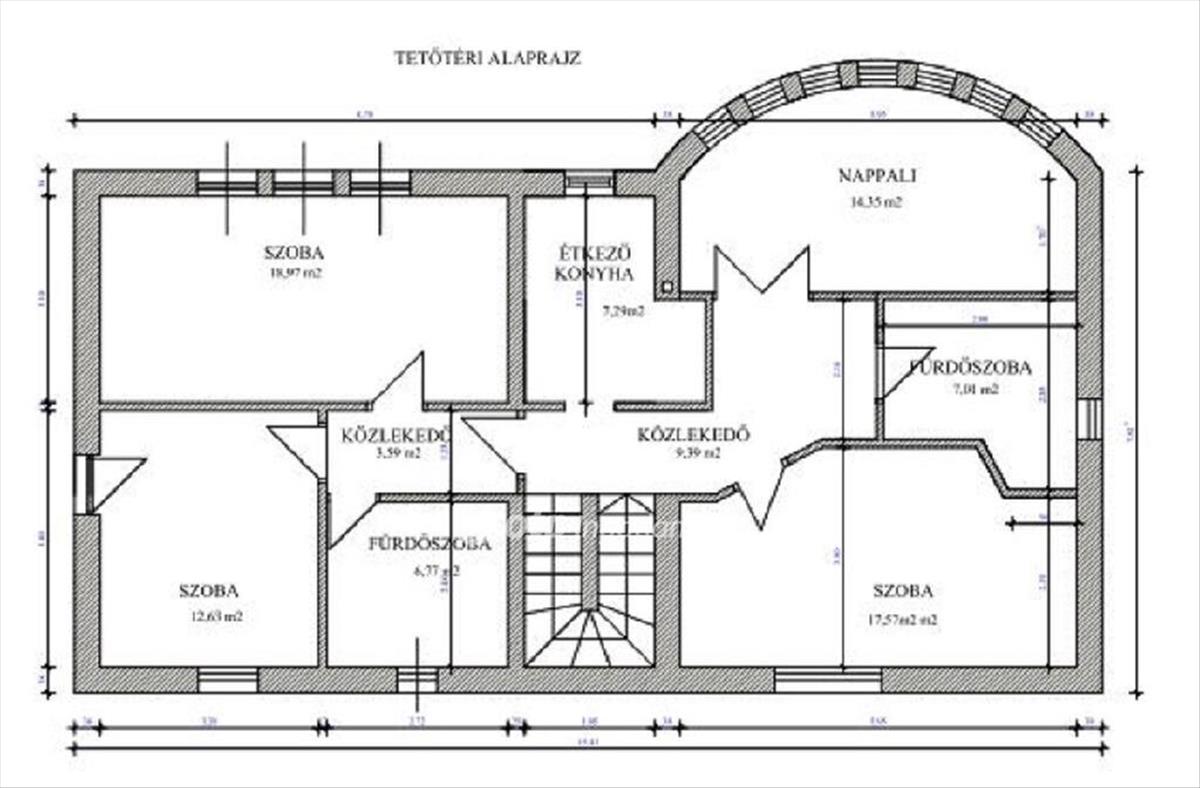-Tetőtér: nappali, 3 háló, 2 fürdő, konyha