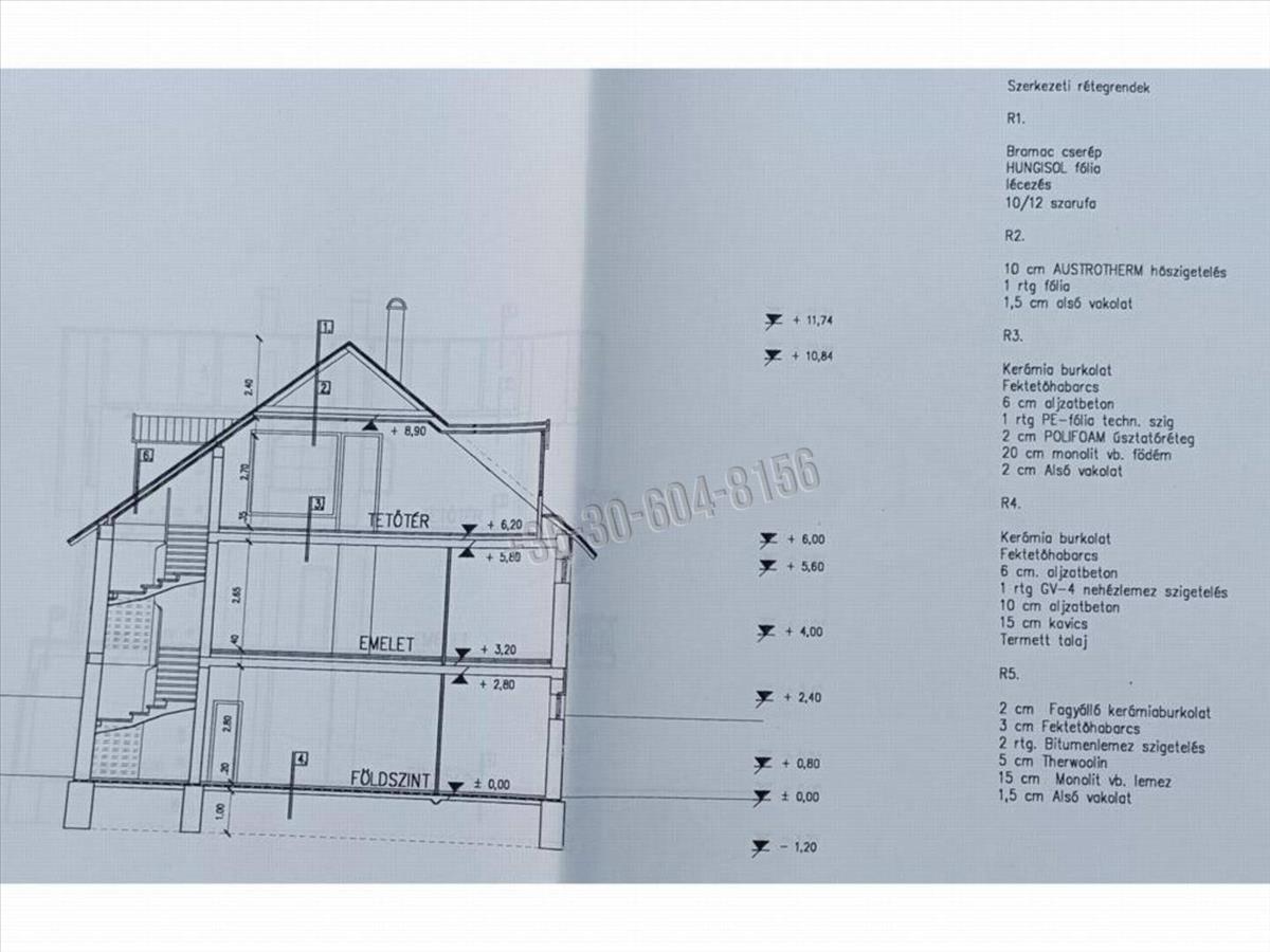 Emelet: 3 hálószoba, étkezőkonyha, 1 dolgozó, fürdő, külön wc, előszoba, erkély
