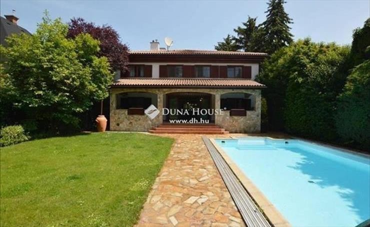 Budaligeten eladó egy nappali + 5 szobás, mediterrán stílusú, medencés családi ház.