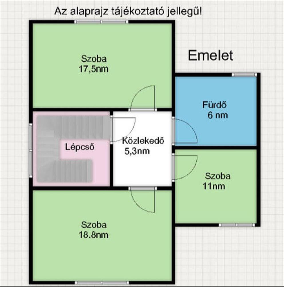 Emeleti részen: 2 tágas hálószoba és 1 kisebb szoba, fürdőszoba.