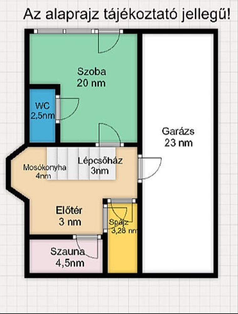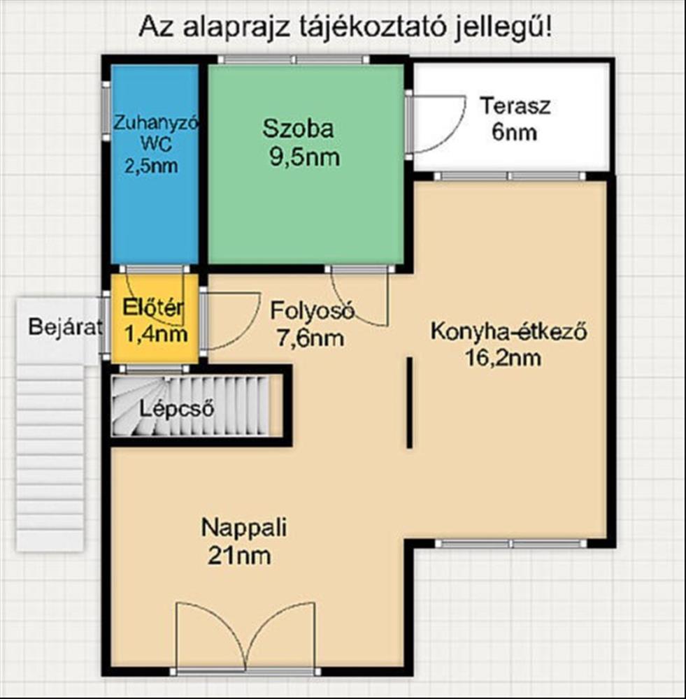 Beosztása földszinten konyha-étkező, teraszkapcsolatos nappali, hálószoba, fürdőszoba.