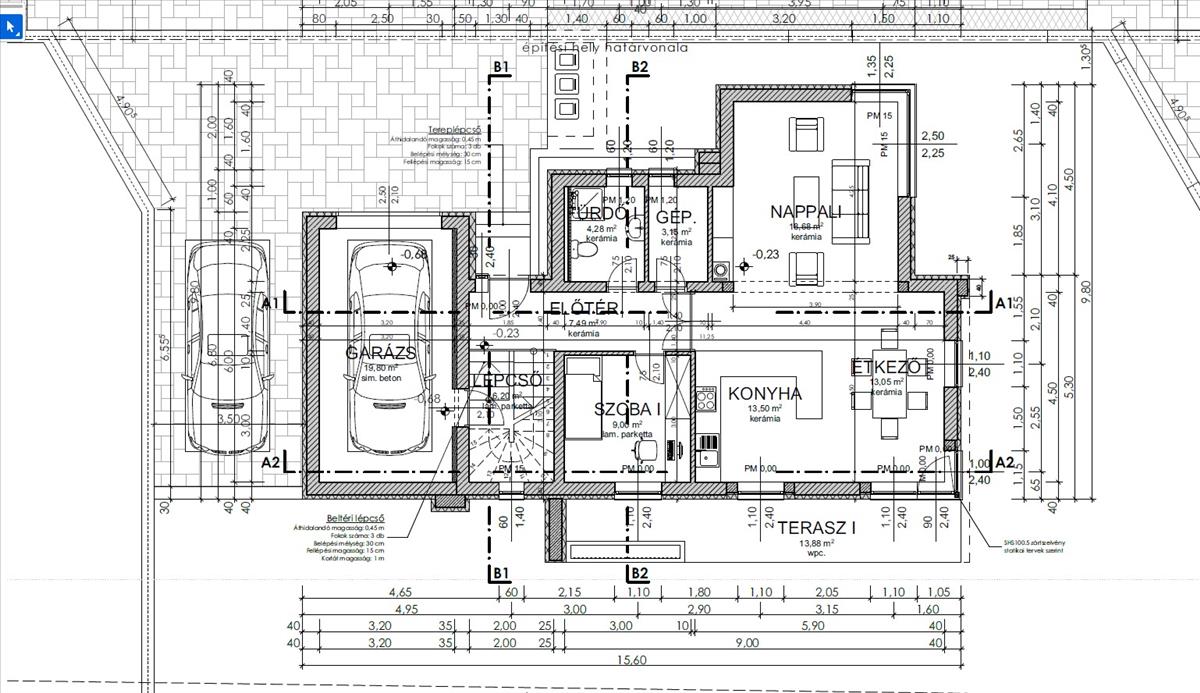 Nappali+4 hálószoba, duplakomforttal, gardróbbal, garázzsal és felszíni beállóval tervezve.