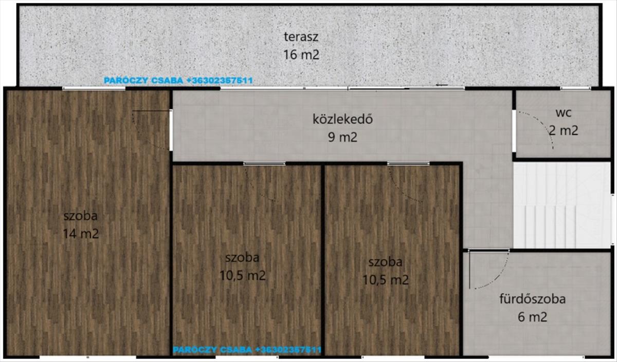 Lépcsőn az emeletre érve található a 3 hálószoba, közlekedő, fürdőszoba, mosdó, terasz.