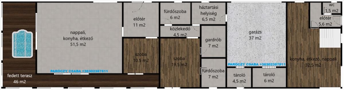 170 m2-es, nappali + 2 szoba, dupla komfort, garázs, tároló, gardrób, hatalmas zárt terasz.