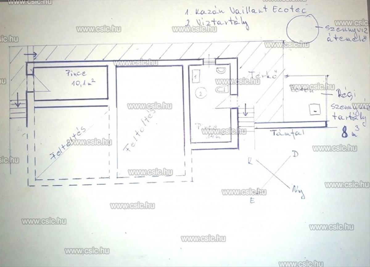Pinceszint: 2 db pince 10 m2 és 15 m2, a nagyobbikban kialakítottak egy Wc-t mosdóval, és itt helyezték el a gázkazánt, (Vaillant) mely a fűtést és a meleg vizet biztosítja.