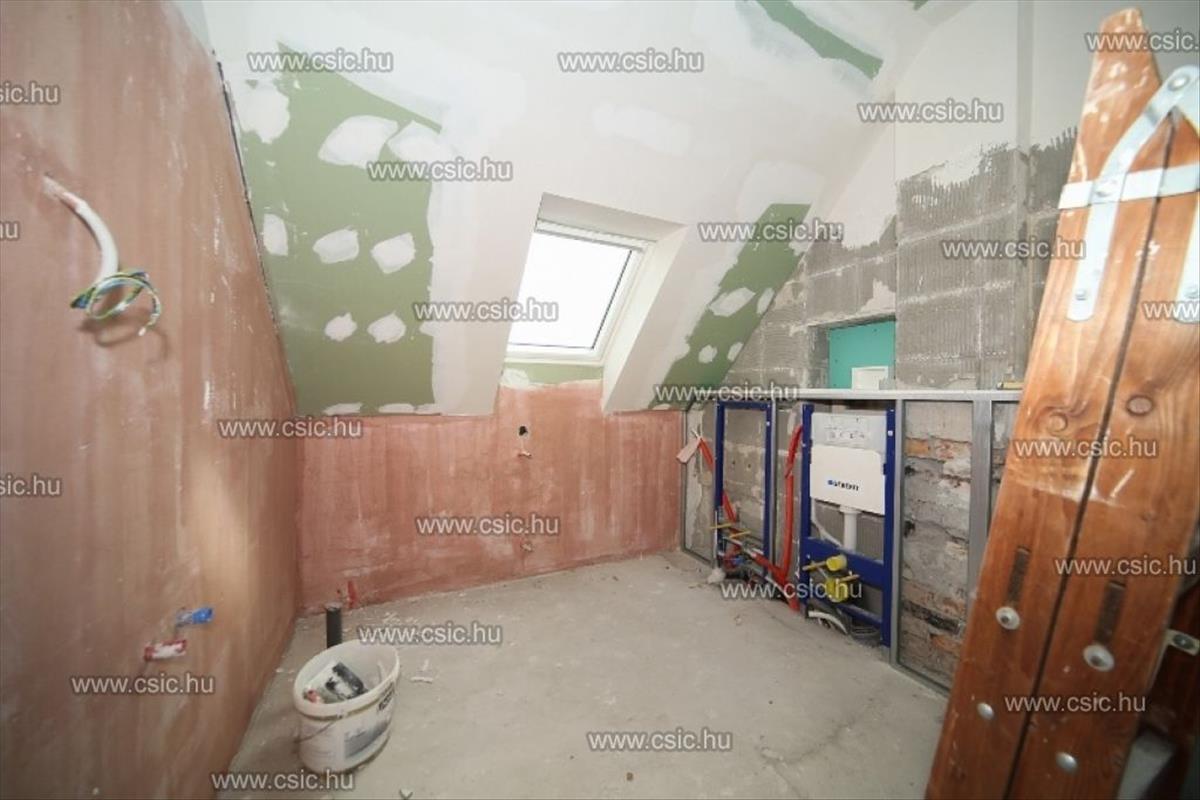 Emeleti szint: Külső lépcsőn át megközelíthető, 3 szoba, fürdő Wc-vel, télikert. Itt az emeleti szinten a falak mozdíthatók, felújítás alatt áll, a víz-, és a fűtésrendszer már felújítva.