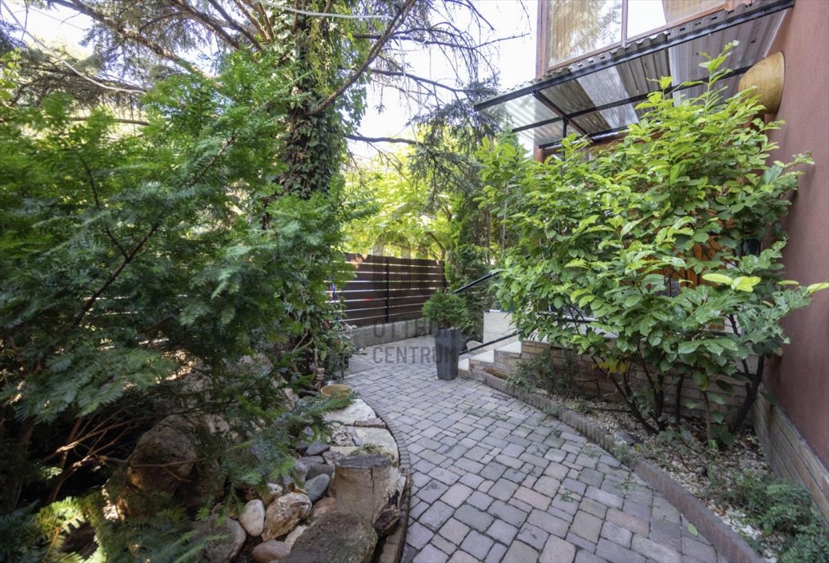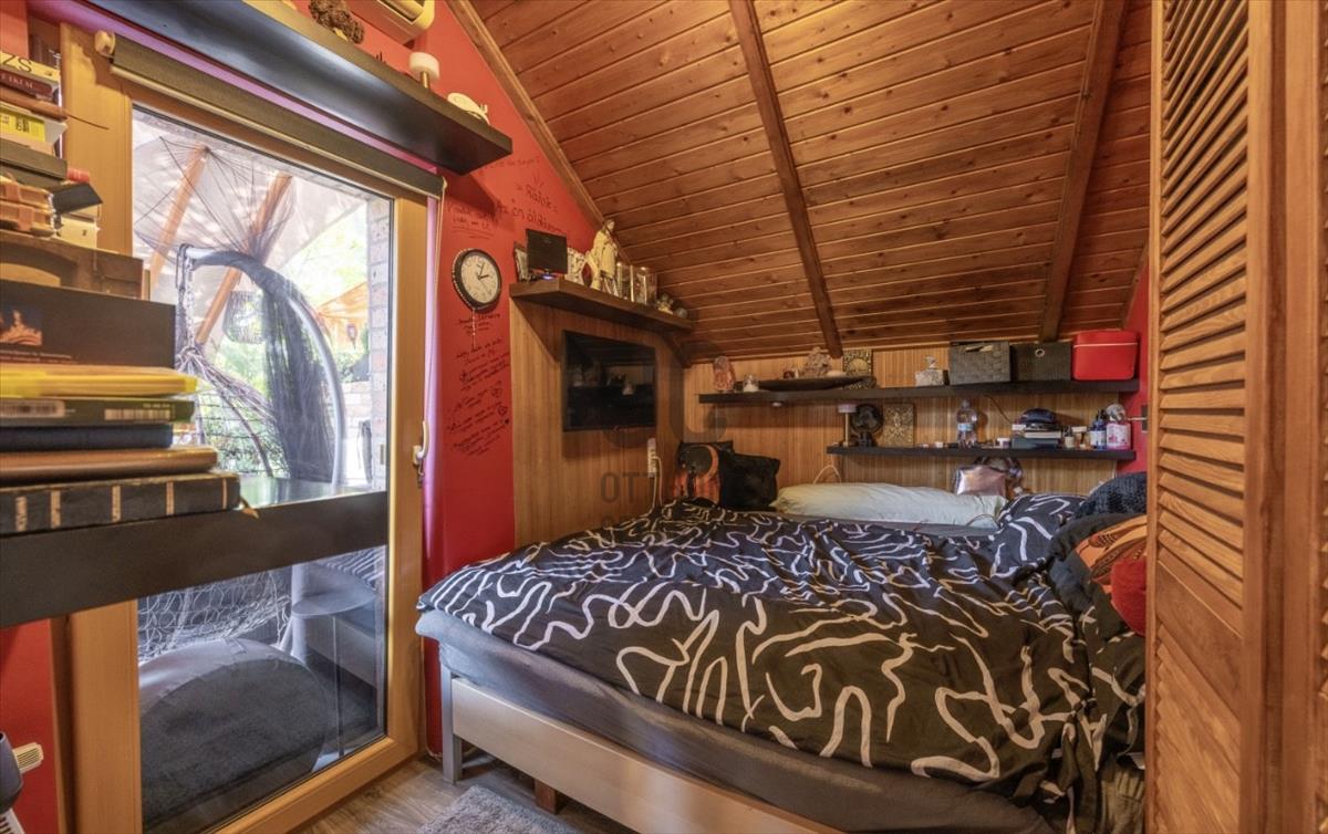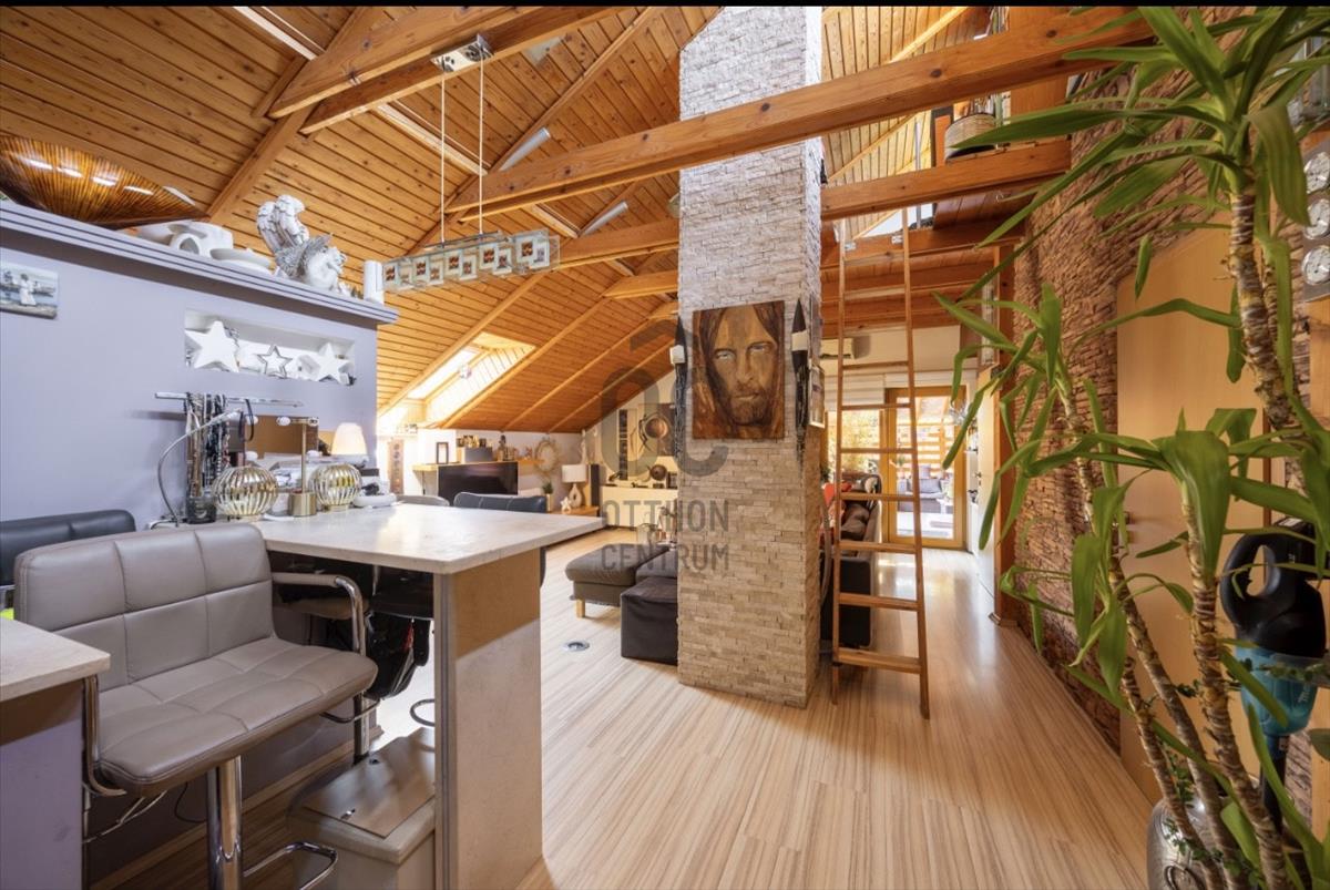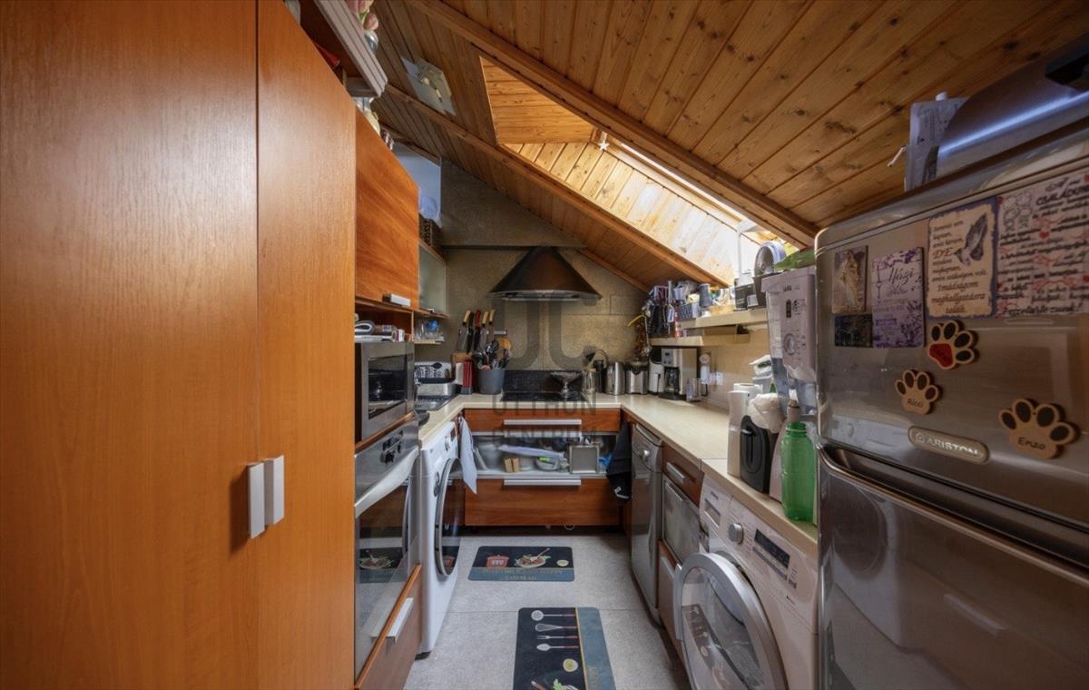A tetőtér igényesen lett kialakítva 2001-ben. Természetes fa burkolata melegséget és harmóniát áraszt. a privát teraszról reggeli fényben fürdőző kert látványa fogad. a földszinti lakás ugyan felújítandó, de éppen ez adja meg azt a szabadságot, amellyel teljesen a saját ízlésére formálhatja. a zárt lépcsőházban pedig egy szauna is helyet kapott – hogy a hétköznapok után mindig legyen hová elvonulni, feltöltődni.