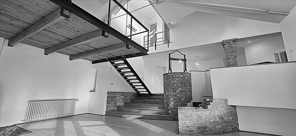 Ebben a térben a fa a vas és a nyers tégla látványa, érzete dominál.