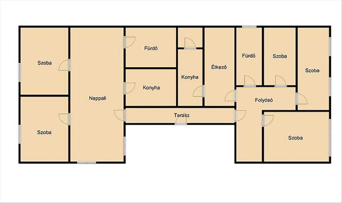 A ház elosztása 5 szobából, 1 félszobából, konyhából és fürdőszobából áll.