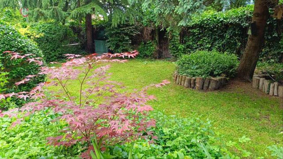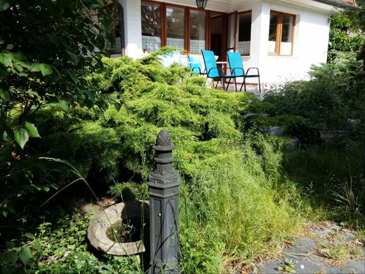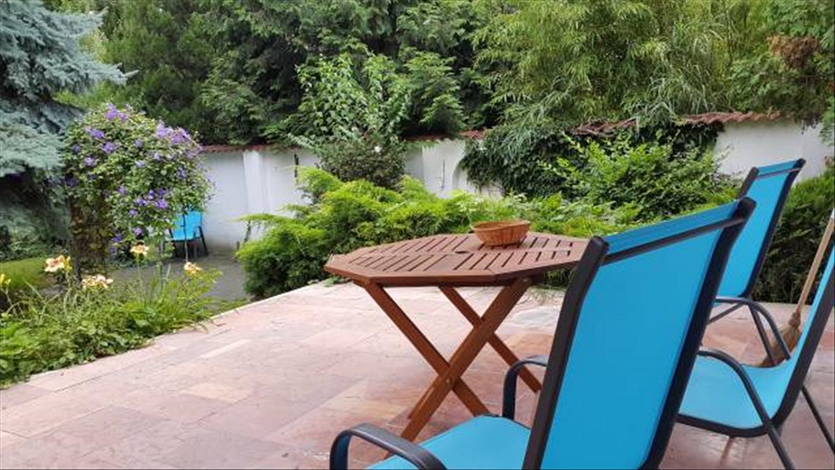 A nappaliból egy teraszra juthatunk, ahonnan a növényekkel beültetett kert tárul elénk.